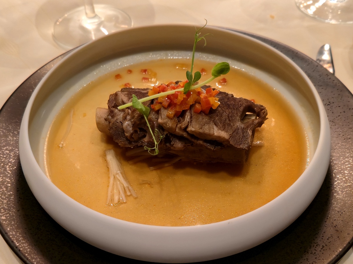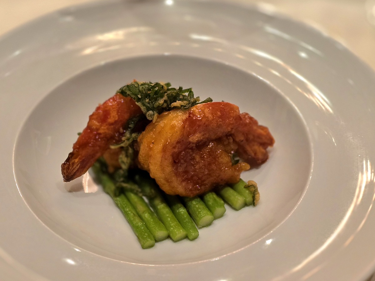 레드 랜턴 웍에 볶은 왕새우. 간장 베이스로 감칠맛 나게 조린 게살·팽이버섯·물고기 부레 스튜로 위를 데우고 나면 3가지 메인코스가 나온다. 중식 스타일로 천천히 브레이즈해 쓰촨 스파이스 소스를 곁들인 미국산 소갈비는 씹을 것도 없이 입에서 사라진다. 알싸한 마비감, 매운 향신료향, 진하고 고소한 소고기 풍미의 궁합이 아주 좋다. 스파이시한 갈릭 소스와 아스파라거스를 곁들인 웍에 볶은 왕새우는 불향과 마늘의 감칠맛에 이어 새우의 단맛이 어우러지며 입안에서 춤을 춘다.