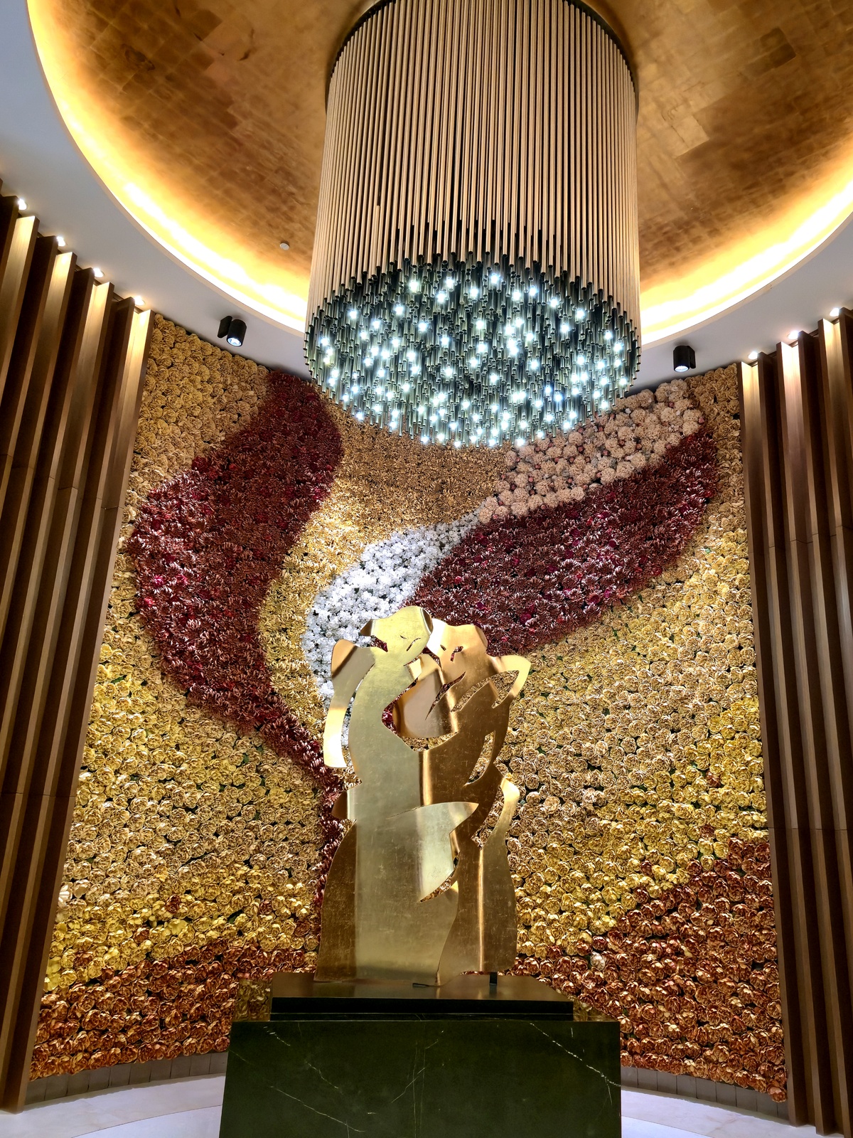 로비로 들어서자 하늘에서 찬란한 빛이 쏟아지는 듯한 거대한 조형물 ‘더 선 라이즈스’가 여행자를 반긴다. 리카르도 라이트닝의 설치 작품으로 금빛과 호박빛으로 반짝이는 수백 개의 유리 조각들이 VIP층에서 공용 로비홀까지 두 개 층을 관통하며 샤워기의 물줄기처럼 화려하게 쏟아져 내리는 풍경이 장관이다. 솔레어가 필리핀을 대표하는 리조트라는 사실을 작품으로 대변하는 것 같다.