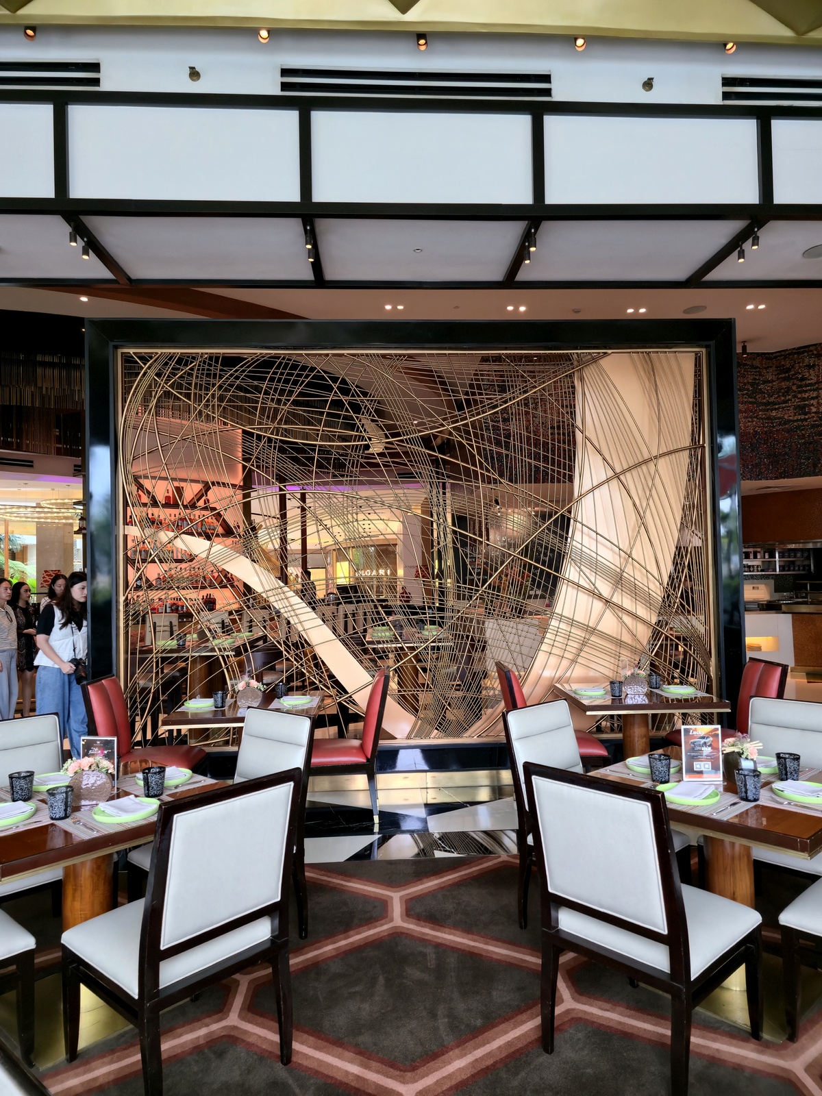 케네스 코본퓨 작품 ‘더 메이즈’ 워터사이드 레스토랑 안에서도 케네스 코본퓨의 독특한 설치작품 ‘더 메이즈’를 만난다. 그는 필리핀 세부 출신의 세계적인 가구·산업 디자이너. 야자과 덩굴식물 줄기인 라탄, 대나무, 바나나과 식물 아바카 등 자연 소재에서 영감을 얻으며 전통 수공예 기술과 현대적 조형 감각을 결합한 작품을 선보여 주목받고 있다. 스카이 타워 엘리베이터실 입구 양쪽 벽에 설치된 작품은 ‘웨이브’. 필리핀의 전통 바구니 짜기와 직물 패턴을 연상시키는 금속 패널을 무광 골드 톤으로 마감했는데 섬세한 시각적 리듬과 부드러운 움직임이 돋보인다.