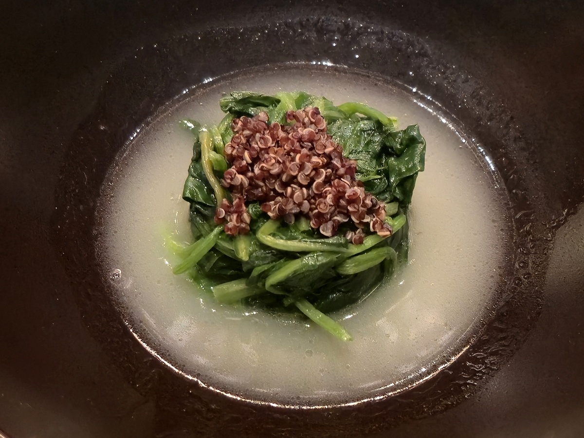 레드 랜턴 퀴노아와 시금치. 레드 렌턴 시칠리아 그릴로 품종 화이트 와인 만드라로사. 생선육수로 끓여낸 퀴노아와 시금치 요리는 은근한 바다의 감칠맛이 배어 있는 퀴노아의 톡톡 씹히는 식감과 부드러운 시금치가 환상적으로 어우러져 새로운 미식의 세계에 눈을 뜨게 만든다. 중식에 면 요리를 빼놓을 수 없다. 블랙페퍼 소스로 센 불 웍에 볶은 누들에 미국산 관자, 청경채, 양배추, 당근을 곁들였는데 해산물의 감칠맛과 채소의 아삭한 식감이 밸런스를 잘 잡아 끊임없이 젓가락을 움직이게 만든다. 시칠리아 토착 품종 그릴로로 빚은 화이트 와인을 곁들이면 생기발랄한 산도와 솔티한 미네랄이 기름진 중식과 환상적으로 어울리며 맛을 더욱 북돋워 준다.