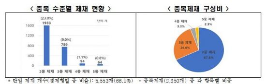 법 위반행위에 대해 '징역 또는 벌금'을 포함한 두 개 이상의 처벌·제재를 부과할 수 있는 항목은 2850개(경제형벌 8403개의 33.9%)에 달했다. 중복 수준별로는 2중 제재 1933개(23.0%), 3중 제재 759개(9.0%), 4중 제재 94개(1.1%), 5중 제재 64개(0.8%)로 나타났다.
