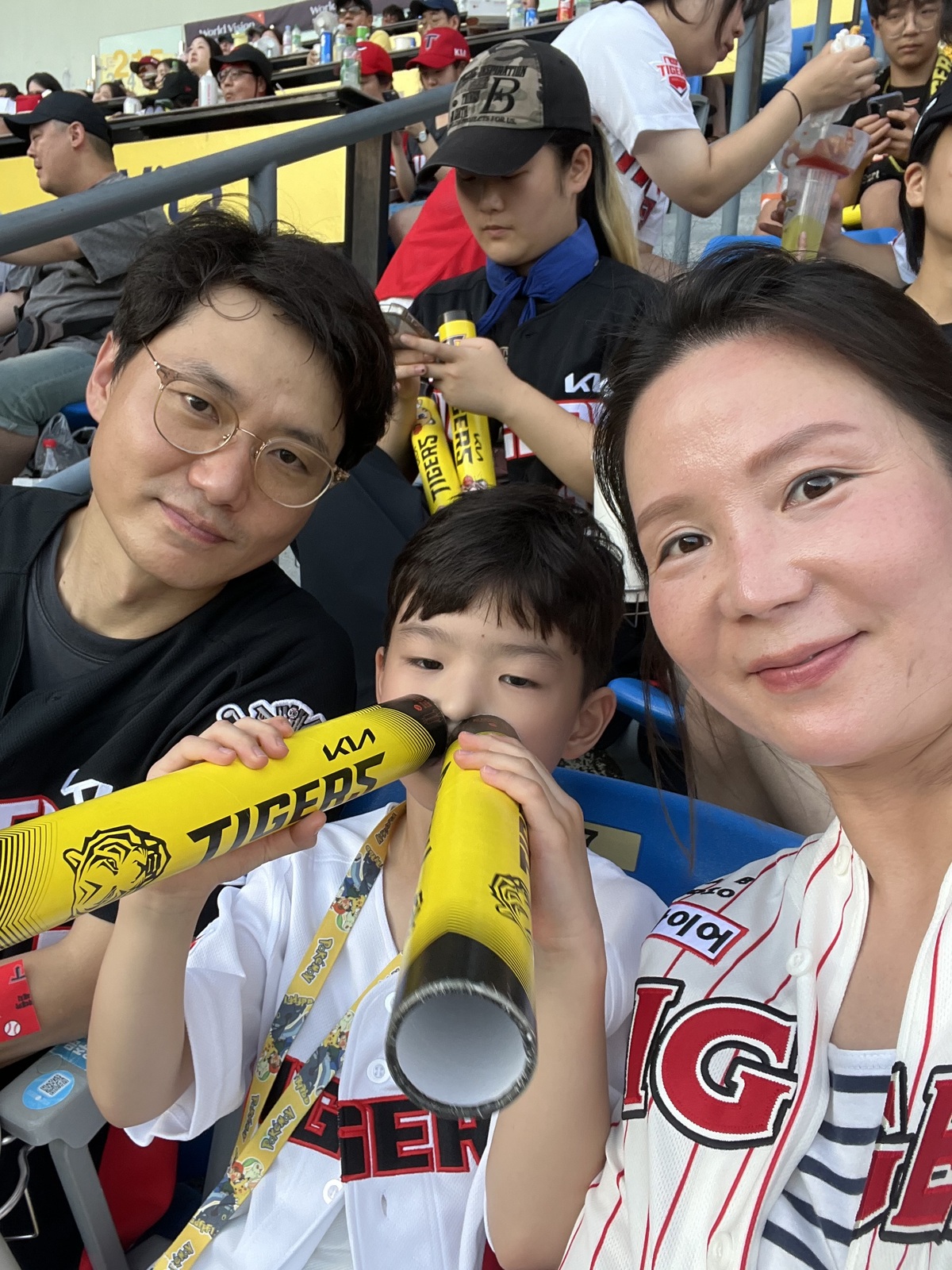 KIA 팬 임상우 씨 가족. 사진=본인 제공 과거와 같이 험난한 직관 문화였다면, 야구장 나들이는 꿈꾸기 어려웠을 터. 하지만 지금의 야구장은 누구나 안전하게 즐길 수 있는 놀이터가 됐다. 한 씨는 “지한이가 내성적인 편이었는데, 야구장에 가서 큰소리로 응원하는 게 자연스러워지자 자신감도 생기고, 더 밝아졌다”며 “지고 있어도 포기하지 않는 선수들, 선수가 다치면 어느 팀 팬이든 걱정하며 응원해주는 문화 등을 통해 아이가 긍정적인 영향을 많이 받는다. 또 남편이 어릴 적 좋아했던 스포츠를 아들도 좋아한다는 점에서 의미가 남다르다. 야구는 우리 가족에게 에너지 그 자체”라고 활짝 웃었다. 아버지의 추억이 아들에게로, 낭만은 이렇게 세대를 건너고 있다. ‘무질서의 낭만 시대’를 지나 야구는 이제 모두가 안전하고 행복하게 즐기는 문화로 자리 잡았다. 거칠던 열정은 질서 속에 녹아들었고, 그때의 뜨거움은 지금의 따뜻함으로 이어진다. 라이터 불빛 아래 울리던 함성은 오늘도 LED 응원봉 속에서 반짝인다.