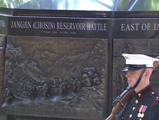 미국 버지니아주 콴티코 국립해병대박물관에 있는 장진호 전투 기념비. ‘장진’(JANGJIN) 뒤에 괄호 하고 ‘초신’(CHOSIN)을 병기한 점이 눈에 띈다. 세계일보 자료사진 1950년 11월 27일 시작해 12월 10일까지 14일간 이어진 장진호 전투는 미 해병대와 ?려야 뗄 수 없는 관계다. 북진하던 미 해병 1사단이 함경남도 개마고원 남쪽 장진호 부근에 매복해 있던 중공군의 기습 공격을 받으며 전투가 시작됐다. 미 해병대는 영하 30도의 혹한 속에 중공군과 사투를 벌인 끝에 포위망을 뚫고 안전한 곳으로 이동할 수 있었다. 당시 미군 등 유엔군이 사용한 지도에는 장진(長津)이 일본식 발음인 ‘초신’(Chosin)으로 표기돼 있었는데, 장진호 전투에서 살아남은 미 해병대 소수정예 병력은 오늘날에도 ‘초신 퓨(Few)’로 불린다. 1995년 7월 미 수도 워싱턴에 들어선 6·25 전쟁 참전 기념 공원은 미군 병사 19명을 형상화한 조각상으로 유명하다. 한반도라는 낯선 공간에서 극도의 긴장감과 공포심에 사로잡힌 채 행군하는 19명 가운데 육군이 14명, 해군·공군이 각 1명씩이고, 나머지 3명은 해병대원이다. 미 해병대가 육군 다음으로 많은 인원을 한국에 보냈음을 알 수 있다.