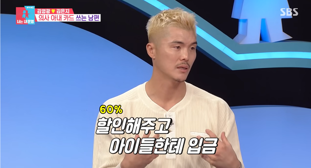 ‘동상이몽2’ 414회. SBS Entertainment 축구선수 김영광이 비상금을 모으기 위해 아내 몰래 딸들과 돈을 거래했다. 지난 17일 방영된 SBS ‘동상이몽2 너는 내운명(동상이몽2)’에서 김영광은 딸에게 “아빠 카드로 사고 60% 할인”이라고 거래를 제안했다. 이어 “어차피 카드값을 엄마(아내)가 내니까 할인한 금액으로 계좌이체 해달라”고 말했다.