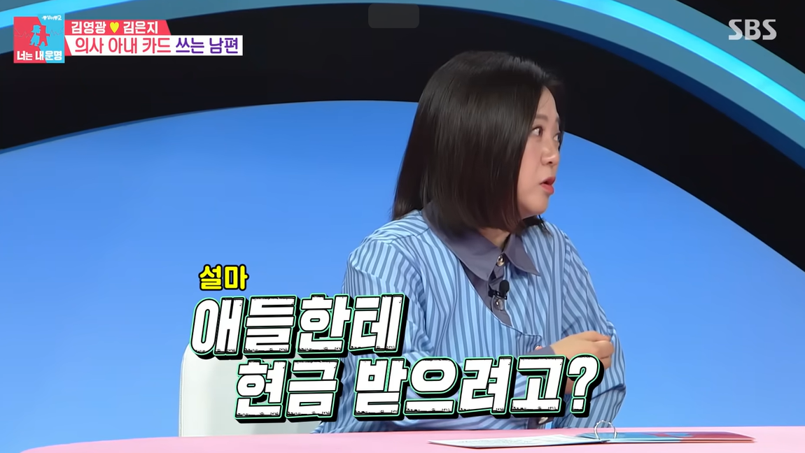 ‘동상이몽2’ 414회. SBS Entertainment 그 모습을 본 패널 김숙이 “애들한테 돈을 받으려는 거냐”고 황당함을 드러냈고, 김영광은 “우리집에선 익숙한 금융거래”라며 이들을 진정시켰다. 그는 “아이들이 사고 싶은 걸 할인해주고 입금받아 조금씩 비상금을 모으고 있다”고 재차 상황을 설명했다. 서장훈은 “손해를 보는 건 엄마겠다”고 상황을 정리했고, 특별 손님으로 출연한 배우 태항호는 “괜찮은데”라며 솔깃했다.