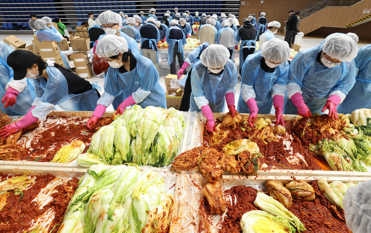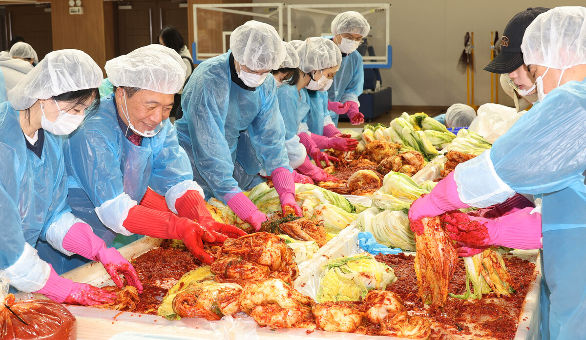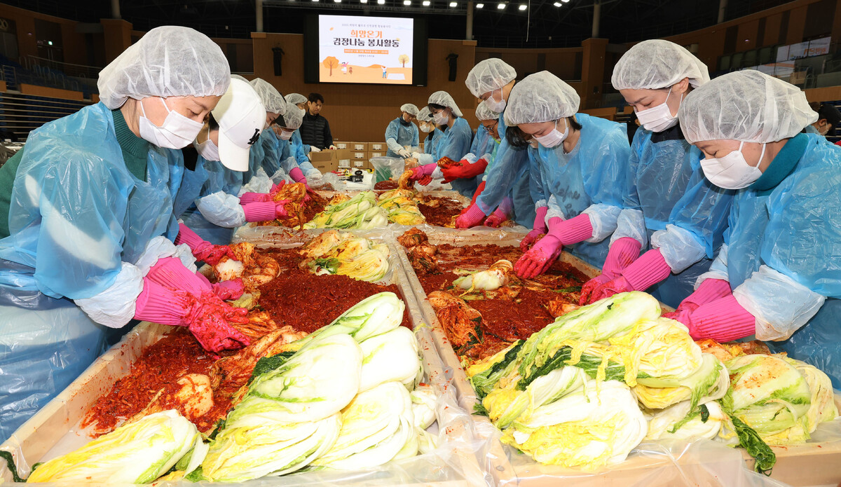 18일 오전 인천 중구 인천국제공항공사스카이돔에서 '희망의 활주로 2025 김장 나눔 봉사활동'이 열리면서 참가자들이 인천 전 지역 취약계층 1,700가구에 전달될 김치를 담그고 있다. 이날 이학재 인천국제공항공사 사장(왼쪽 두번째)과 인천광역시자원봉사센터 이대형 이사장 그리고 인천국제공항공사 임직원, 자원봉사자들은 김치 2,400kg을 담갔다.