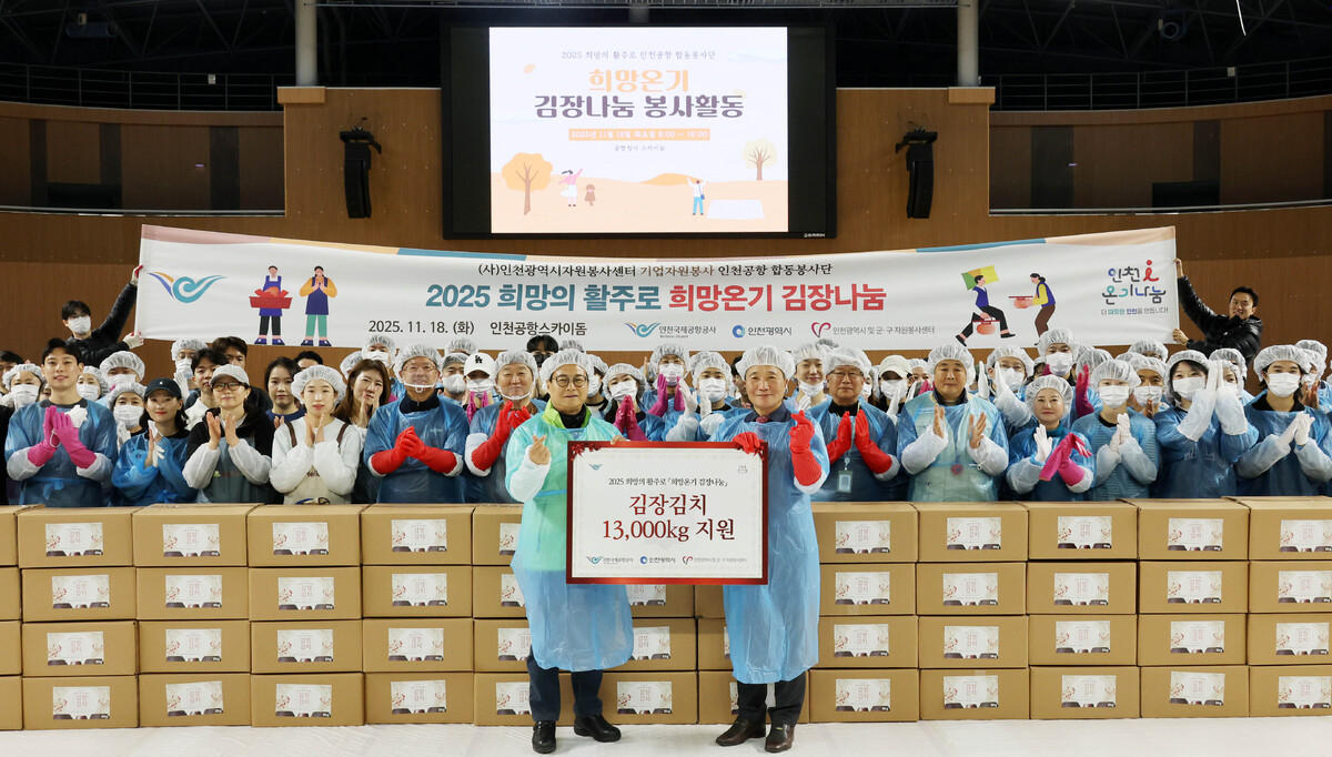 18일 오전 인천 중구 인천국제공항공사스카이돔에서 열린 '희망의 활주로 2025 김장 나눔 봉사활동'에서 이학재 인천국제공항공사 사장(앞줄 오른쪽)과 인천광역시자원봉사센터 이대형 이사장, 인천국제공항공사 임직원, 자원봉사자들이 기념 촬영을 하고 있다. 이날 참가자들은 인천 전 지역 취약계층 1,700가구에 전달될 김치 2,400kg을 담갔다. 18일 오전 인천 중구 인천국제공항공사스카이돔에서 '희망의 활주로 2025 김장 나눔 봉사활동'이 열리면서 참가자들이 인천 전 지역 취약계층 1,700가구에 전달될 김치를 담그고 있다. 이날 이학재 인천국제공항공사 사장과 인천광역시자원봉사센터 이대형 이사장, 인천국제공항공사 임직원, 자원봉사자들은 김치 2,400kg을 담갔다. 인천=이제원 선임기자