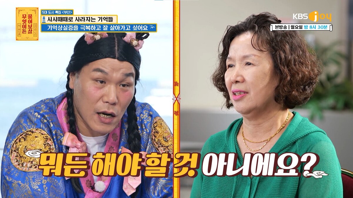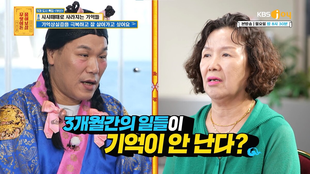 기억상실을 비롯해 후각과 미각 등 감각 이상도 겪고 있는 사연자.. KBS JOY '무엇이든 물어보살' 제공 이에 서장훈은 “기억이나 감각이 완전히 사라진 게 아니라 부분적으로 남아 있는 만큼 회복 가능성이 있어 보인다”며 희망을 전했다. 보살들이 운동과 숙면 등 건강 관리를 강조하자, 사연자는 “새벽 4시에 일어나 가족과 함께 치매 예방 퀴즈를 풀고 국민 체조를 한다”며 “생활이 거의 패턴화되어 있다”고 말했다.