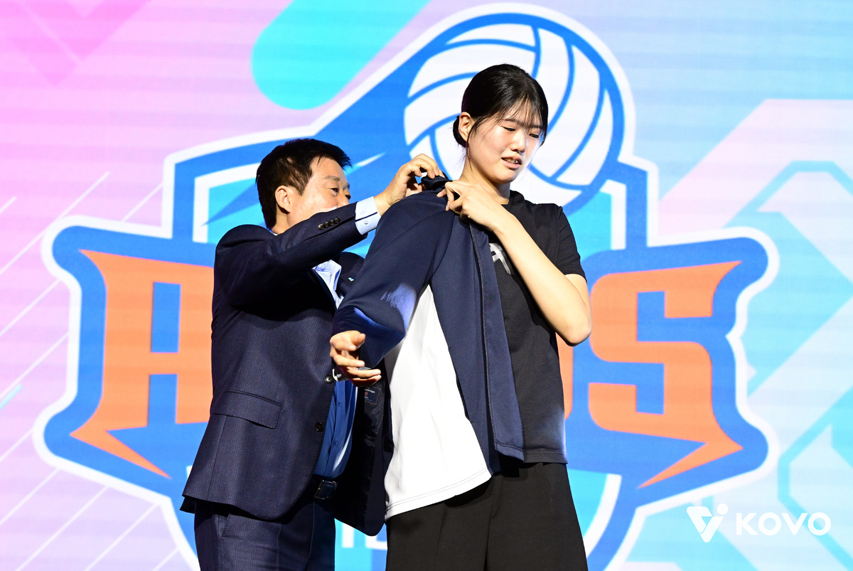 2025~2026 한국배구연맹(KOVO) 여자부 신인 드래프트가 열린 5일 서울 강서구 메이필드 호텔. 이번 드래프트는 ‘이지윤 드래프트’라는 별칭으로 불릴 정도로 중앙여고 미들 블로커 이지윤의 전체 1순위 지명이 당연한 분위기였다. 전체 1순위가 누구냐보다는 어느 구단의 구슬이 나오느냐가 초미의 관심사였다. 신무철 KOVO 사무총장이 아나운서의 진행에 따라 추첨통 버튼을 눌렀고, 나온 구슬의 색깔은 하얀색, 도로공사의 구슬이었다. 지난 시즌 5위로 전체 100개의 구슬 중 20개를 넣어 페퍼저축은행(35개), GS칼텍스(30개)보다 적은 확률이었지만, 행운의 여신은 도로공사를 선택했다. 지난 2년 연속 전체 1순위 지명권을 얻어 미들 블로커 김세빈, 세터 김다은을 뽑았던 도로공사는 3년 연속 1순위 지명권을 획득했다. 함박웃음을 지으며 무대에 오른 도로공사 김종민 감독의 선택은 당연히 이지윤이었다. 이지윤은 188cm의 좋은 신장에 다양한 공격을 구사할 줄 알고 힘이 좋다는 평가를 받았다. 최근 끝난 U-21 세계여자선수권에서도 주전으로 활약했다.
