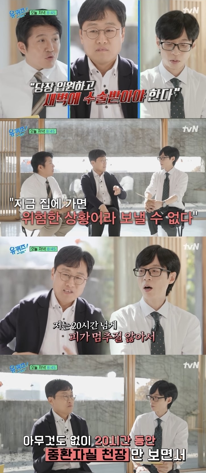 유튜브 채널 ‘유퀴즈 온 더 튜브’ 캡처 응급실에 도착하자 의료진은 즉시 검사를 진행했다. 그는 “응급실에 계신 의사분이 피도 뽑고 심전도 측정도 하시더니 ‘당장 입원하고 새벽에 수술받아야 한다’고 하더라. 지금 집에 가면 위험한 상황이라 보낼 수 없다고 했다”고 당시의 급박함을 전했다.