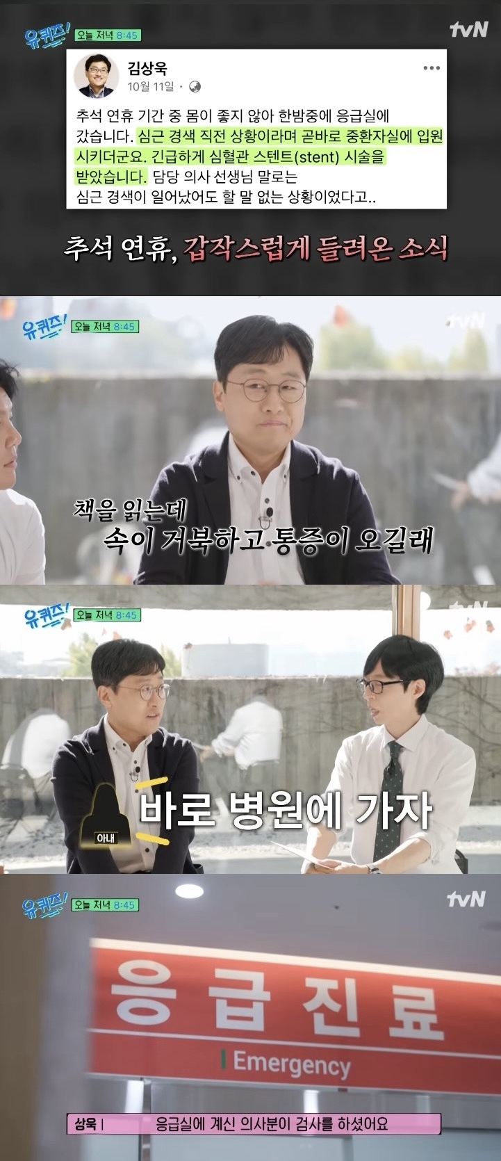 김 교수는 집에서 책을 읽던 중 예고 없이 찾아온 이상 신호에 대해 “밤에 집에 앉아서 책을 읽는데 속이 거북하고 통증이 오길래 아내한테 얘기했더니 바로 병원에 가자고 하더라”라고 말했다.