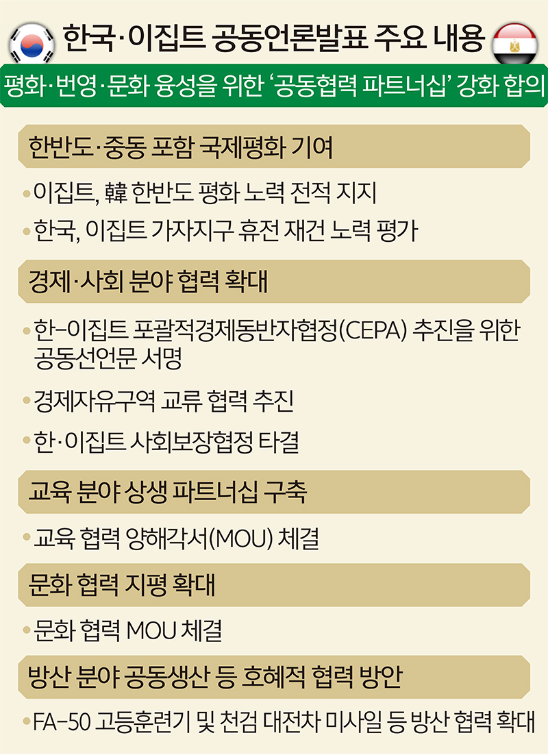 이 대통령은 “양국 모두 강대국의 이해관계가 교차하는 전략적 요충지에 터를 잡고 살아왔기에 고뇌하고 인내하며 평화를 만들어 가는 일이 얼마나 중요하고 험난한 일인지 잘 알고 있다”며 “경제·문화·평화 등 각 분야에서 이뤄질 양국의 협력이 오늘보다 나은 내일을 만들 수 있으리라 확신한다”고 말했다. 1995년 시작돼 올해로 30주년을 맞은 한국과 이집트 간 수교를 언급한 이 대통령은 “양국이 함께한 30년간의 동행은 이제 미래로 향한다. 한국국제협력단(KOICA)에서 설립한 한·이집트 기술대학에서 이집트 청년들은 기계·전기·자동차 등 핵심 산업의 기술을 스스로 익히며 성장의 기회를 늘리고 꿈과 희망을 키우고 있다”며 “배움에 목말라 매일 초등학교까지 왕복 4시간을 걸어 다녔던 기억이 있기에 교육의 힘이 무엇인지 잘 알고 있다”고 했다.