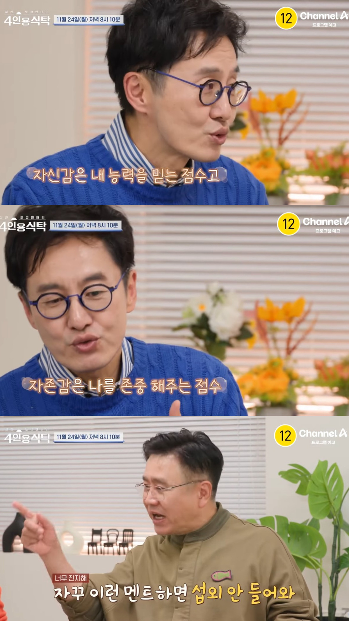 김재원에게 예능 프로그램 섭외가 안 들어오는 이유. 유튜브 채널 '채널아하: 채널A Health & Asset' 영상 캡처 또, 방송 중 “자신감은 내 능력을 믿는 점수이고, 자존감은 나를 존중해주는 점수”라는 말에 했는데, 이광기는 “이러니까 형이 예능이 안 들어오는 것”이라며 예능인의 조언을 건네 절친들을 폭소케 했다. 김재원은 퇴사 후 다음 달 통장에 바로 마이너스가 찍혀 놀랐다며, 동료들에게 밥을 사려고 하면 “네 앞가림도 못 하면서 무슨 소리냐”는 만류를 듣는 등 프리랜서 아나운서의 현실을 솔직하게 털어놓아 절친들의 안타까움을 샀다.