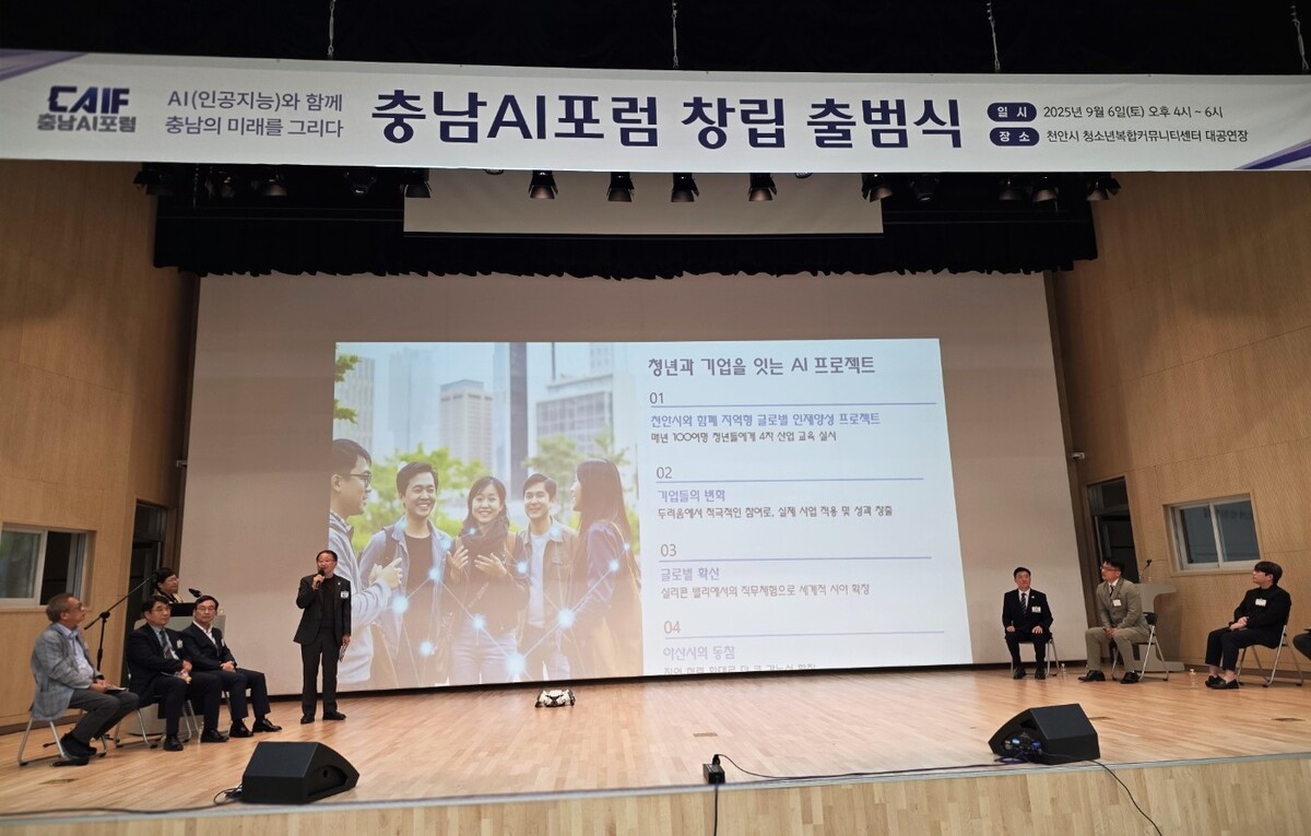 충남AI포럼 창립 출범식이 6일 천안시 불당동 청소년복합문화커뮤니티센터에서 열렸다. 충남AI포럼(공동대표 문진석·김학민 )은 6일 천안시 청소년복합문화커뮤니티센터에서 창립 출범식을 가졌다. 출범식에는 대학교수 등 AI분야 전문가와 청소년·스타트업 지원 후원자, 교육산업 전문가, 의료계 관계자와 회원 등 500여명이 참석했다. ‘AI로 혁신하는 충남의 경쟁력’을 비전으로 하는 충남AI포럼은 산·한·연·관·민 AI 협력 플랫폼으로 지속가능한 충남 구현을 목표로 설정했다. 이를 위해 △주력산업 ‘AI 제조혁신’생태계 구축 △AI 신산업 인재양성·청년 일자리 창출 △생활밀착 AI 돌봄·스마트복지 확산을 추진한다.