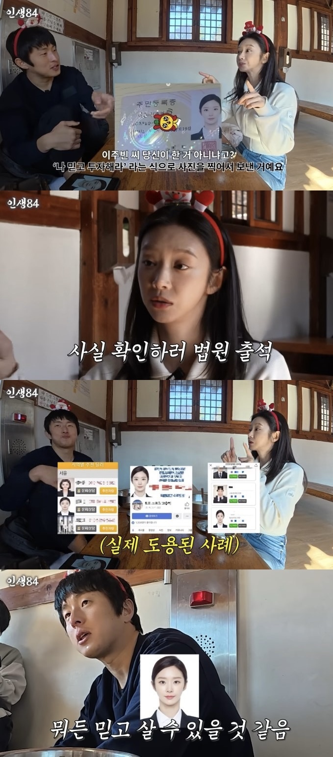 기안84가 “투자 사기 하셨냐고 (왔냐)”고 묻자, 이주빈은 “맞다. 이 사진으로 가짜 주민등록증을 만들어 ‘나 믿고 투자해라’라는 식으로 사진을 찍어 보내고 있었더라”고 답했다. 심지어 법원에서 사실 확인을 위해 출석 통보까지 받았다고 덧붙였다.