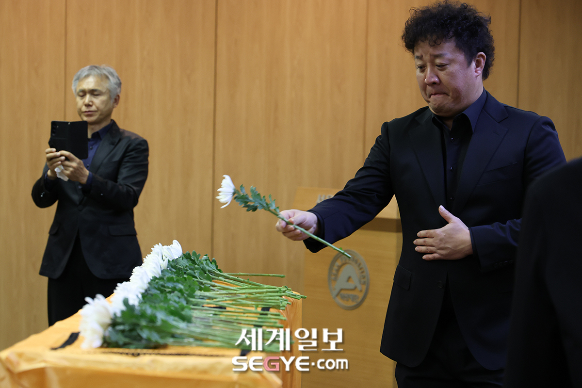 영결식 헌화하는 배우 최수종 배우 故 이순재의 영결식 및 발인이 27일 오전 서울 송파구 서울아산병원 장례식장에서 엄수됐다. 동료 배우들이 헌화를 하고 있다.