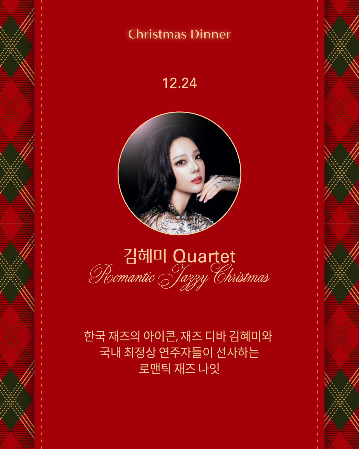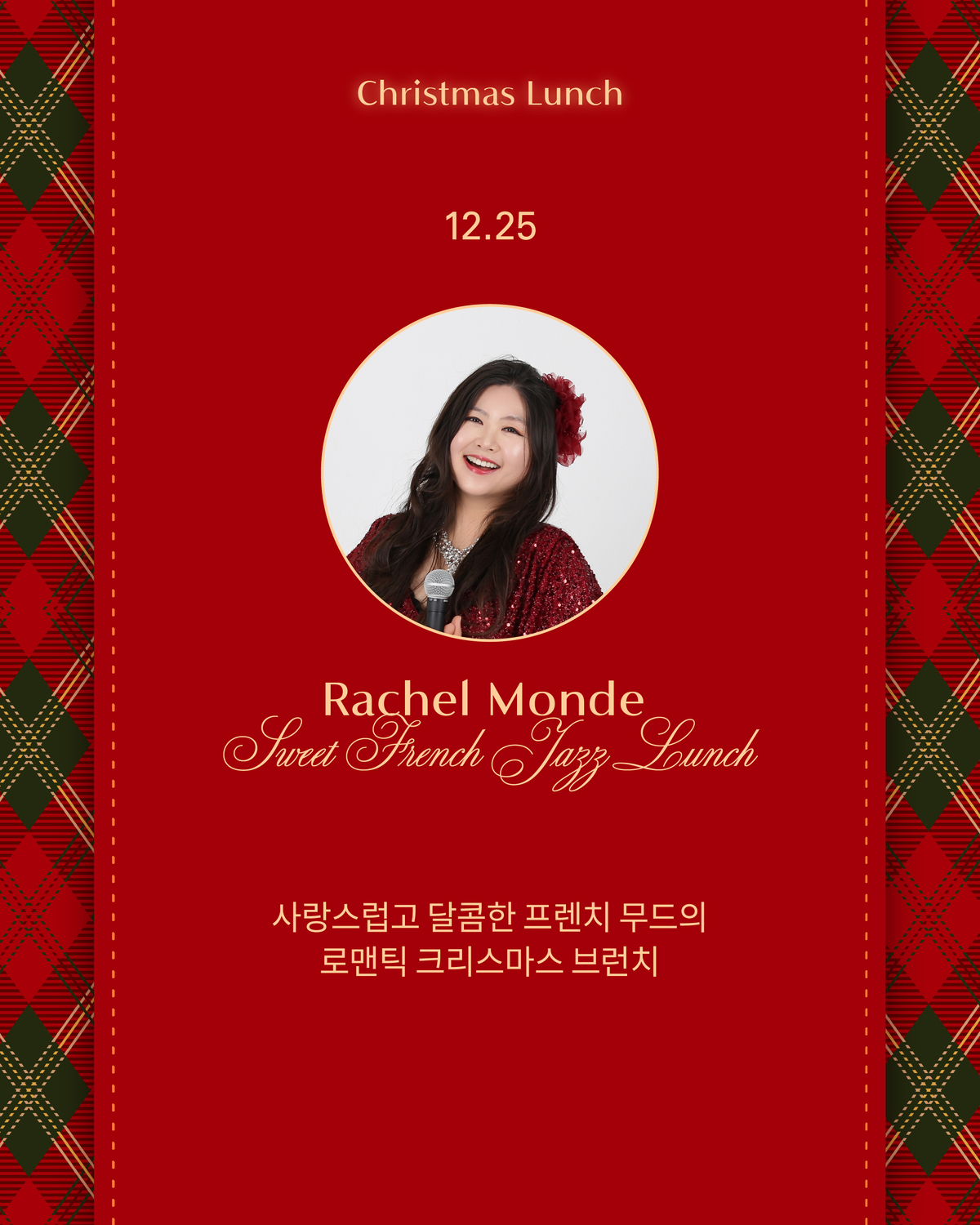 크리스마스 당일에는 점심과 저녁으로 나눠 음식과 공연을 즐길 수 있다. 이날 오후 1시에는 ‘스위트 프렌치 재즈 런치’란 이름으로 사랑스럽고 달콤한 프렌치 무드의 로맨틱 크리스마스 브런치가 제공된다.