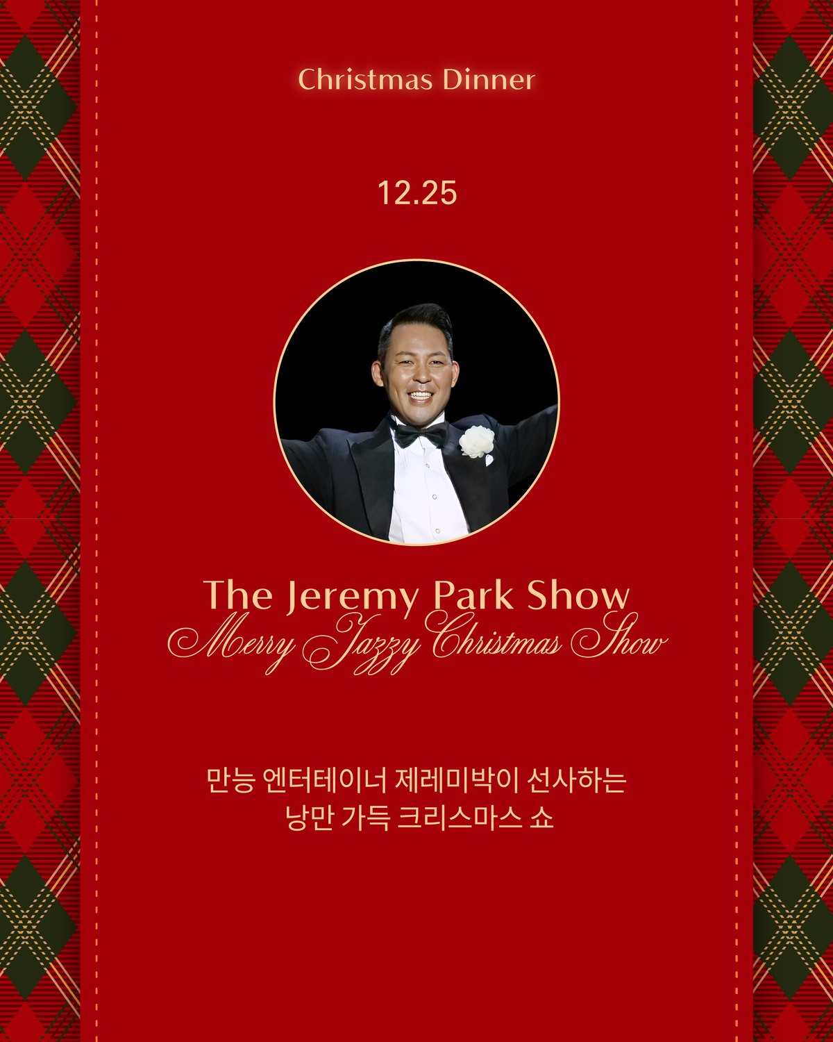 오후 5시와 8시 저녁 1·2부에서는 크리스마스 디저트가 포함된 스페셜 다이닝이 준비돼 있다. 공연으로는 만능 엔터테이너 제레미박이 낭만 가득하고 웃음이 넘치는 크리스마스의 특별한 밤을 선사한다.