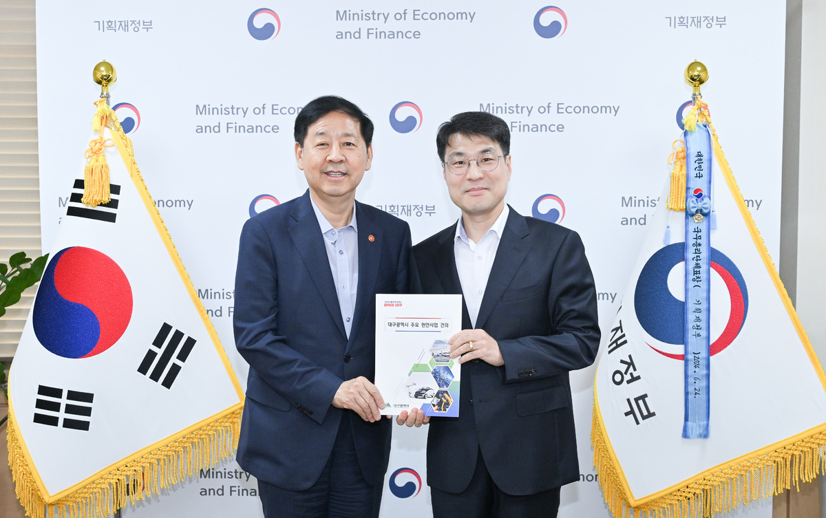 김정기(오른쪽) 대구시장 권한대행이 지난 8월 구윤철 경제부총리 겸 기획재정부 장관을 만나 기념 촬영을 하고 있다. 대구시 제공 특히 대구·경북(TK) 통합신공항의 경우 기획재정부·국방부가 참여하는 공식 태스크포스(TF) 구성을 의무화한 국회 부대의견을 포함해 사업 추진의 제도적 기반이 더욱 공고해졌다. 김정기 대구시장 권한대행은 “대구의 미래 산업 전환을 위한 핵심 기반을 확보했다”며 “반영된 사업들이 차질 없이 진행되도록 정부와 긴밀히 협력하고, 시민이 체감할 변화 창출에 최선을 다하겠다”고 말했다.