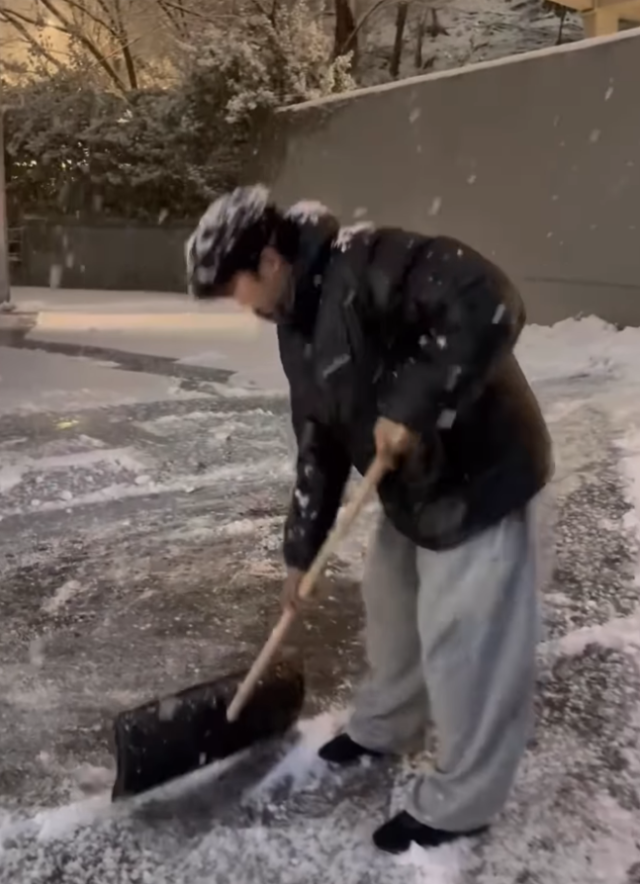 영상 속 임영웅은 패딩과 트레이닝 바지의 편안한 차림을 하고 집 앞으로 보이는 비탈길에서 대형 삽으로 눈을 치우고 있다.