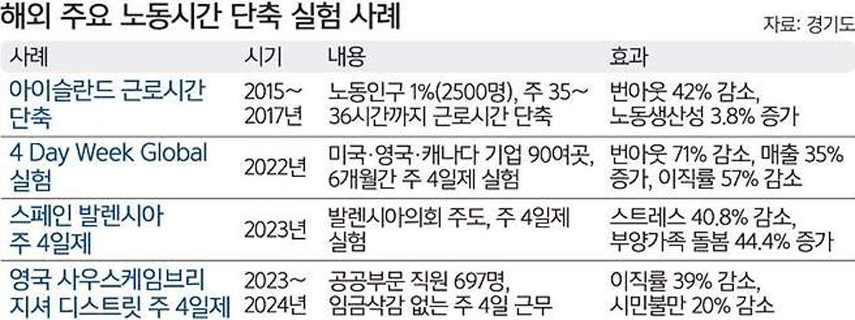 해외 주요 노동시간 단축 실험 사례. 세계일보 DB 다만, 이번 사업이 시범사업이고 세계적으로 4.5일제를 둘러싼 논란이 ‘진행형’이라는 점에서 앞으로 개선 여지는 상당해 보인다. 실제로 영국 사우스케임브리지셔 자치구에선 2023∼2024년 공공부문 직원 697명을 대상으로 진행한 ‘임금 삭감 없는 주 4일제 근무’를 통해 이직률 39% 감소, 시민 불만 건수 20% 감소라는 효과를 봤다.