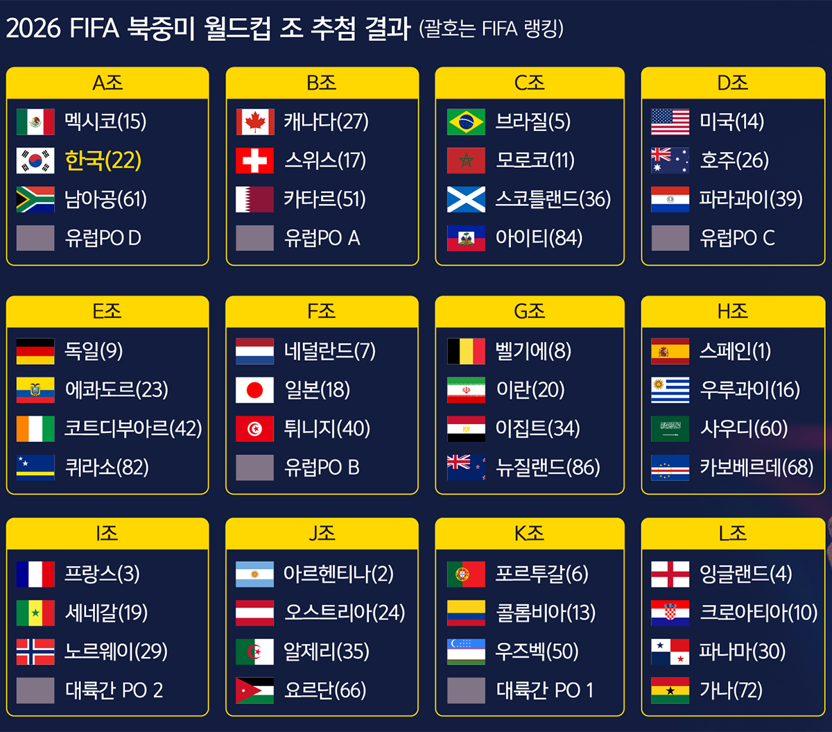 방심은 금물이지만 ‘죽음의 조’는 일단 피했다. 유럽 플레이오프(PO) 진출팀이 어디가 되느냐가 변수이지만 수월한 조 편성을 받아들었다고 해도 무방하다.