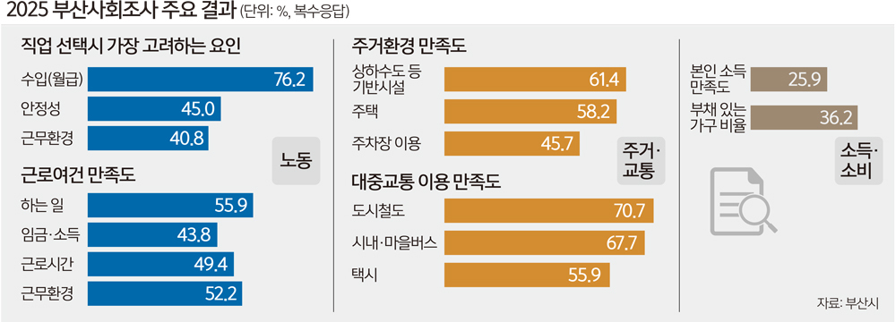 11월 15일 부산 광안리해수욕장 일대에서 열린 제20회 부산불꽃축제에서 화려한 불꽃이 가을 밤바다를 수놓고 있다. 연합뉴스 시는 시민 의식·생활 수준과 사회 변화를 파악해 지역사회 정책 개발의 기초 자료로 활용하기 위해 지난 8월19일부터 9월8일까지 부산에 거주하는 1만7860개 표본 가구 내 15세 이상 시민 3만1744명을 대상으로 부산사회조사를 실시했다. 올해 조사는 조사원이 직접 가구를 방문해 노동, 주거·교통, 문화·여가, 교육, 소득·소비 5개 분야 55개 항목에 대해 면접조사 및 배포조사(자기기입식)로 진행했다. 먼저 노동분야에서 현재 하고 있는 일(직장)의 근로 여건에 대한 전반적인 만족도는 51.9%로 나타났다. 시가 고용 확대를 위해 우선적으로 지원해야 할 주요 시책으로는 일자리 확대(47.1%)와 기업유치 및 고용촉진(24.9%)으로 나타났다. 직업 선택 요인(복수응답)으로는 수입(임금)이 76.2%로 가장 높았고, 이어 안정성(45.0%)이 뒤를 이었다. 주거·교통 분야 부산시민들의 만족도가 상대적으로 높았는데, 부산 시민 10명 중 7.7명이 계속 부산에서 살고 싶다고 응답했다. 만족도가 가장 높은 부문은 상하수도 등 기반시설(61.4%)이었고 주차장 이용(45.7%)이 가장 낮게 나타났다. 대중교통 이용 부문에서도 모든 교통수단에 대한 만족도가 상승했다. 만족도가 가장 높은 수단은 지하철·경전철·동해선(70.7%)이며 택시(55.9%)의 경우 2023년 대비 가장 많이 상승(6.2%포인트)했다.