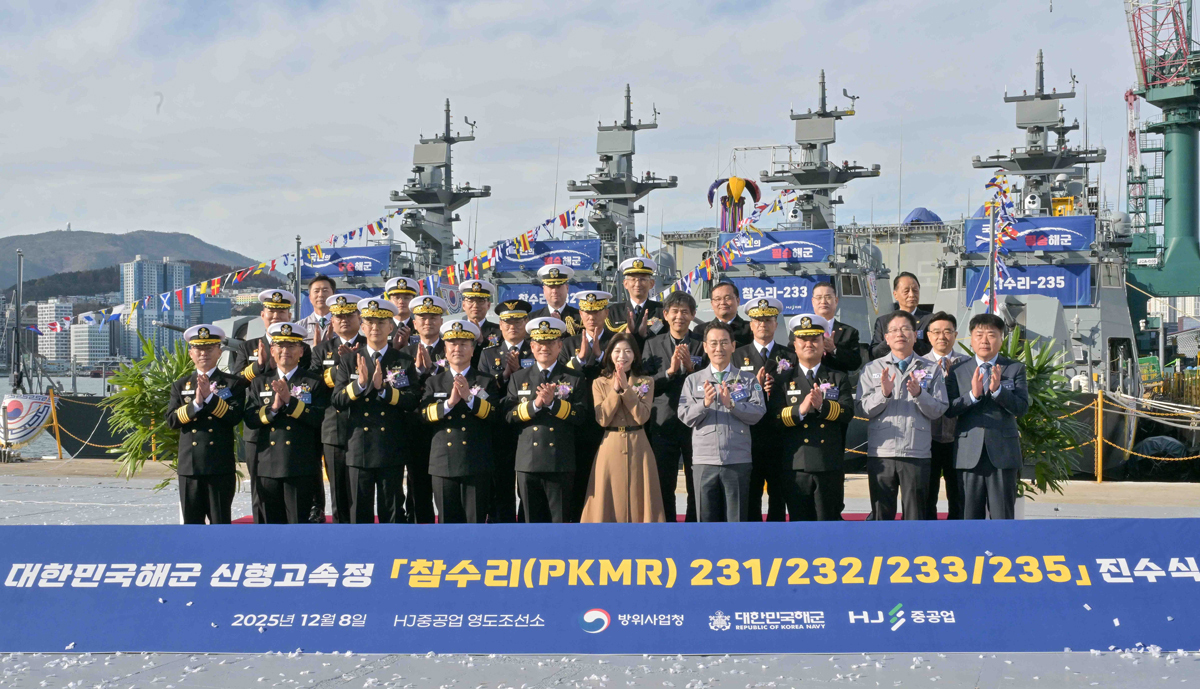 해군 신형고속정 통합 진수식에 참가한 해군 및 HJ중공업 관계자들이 기념사진을 촬영하고 있다. 해군작전사령부·HJ중공업 제공 HJ중공업은 방위사업청에서 발주한 해군 신형고속정 16척을 모두 건조해 해군에 인도한 바 있다. 이후 개선사항 등을 반영한 2단계 사업(Batch-II)도 지금까지 발주된 12척을 모두 수주하고, 건조 중이다. 유상철 HJ중공업 대표는 “2016년 첫 신형고속정을 진수한 이후 지금까지 총 20척의 신형고속정을 성공적으로 진수했다”며 “해군 함정 전문 방위사업체로서 쌓아온 기술력과 건조 경험을 토대로 K-방산의 위상 제고에 기여하겠다”고 강조했다.