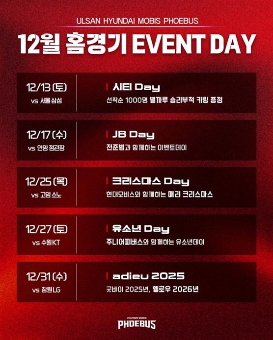 사진=현대모비스 구단 제공 25일 소노와의 경기에서는 ‘크리스마스DAY’가 진행된다. 크리스마스를 맞아 빨간색 상의를 착용한 선착순 300명의 관중을 대상으로 손수건(반다나)이 증정되며, 스노우볼 에어샷 등 다채로운 크리스마스 이벤트로 팬들에게 즐거움을 선사할 예정이다.