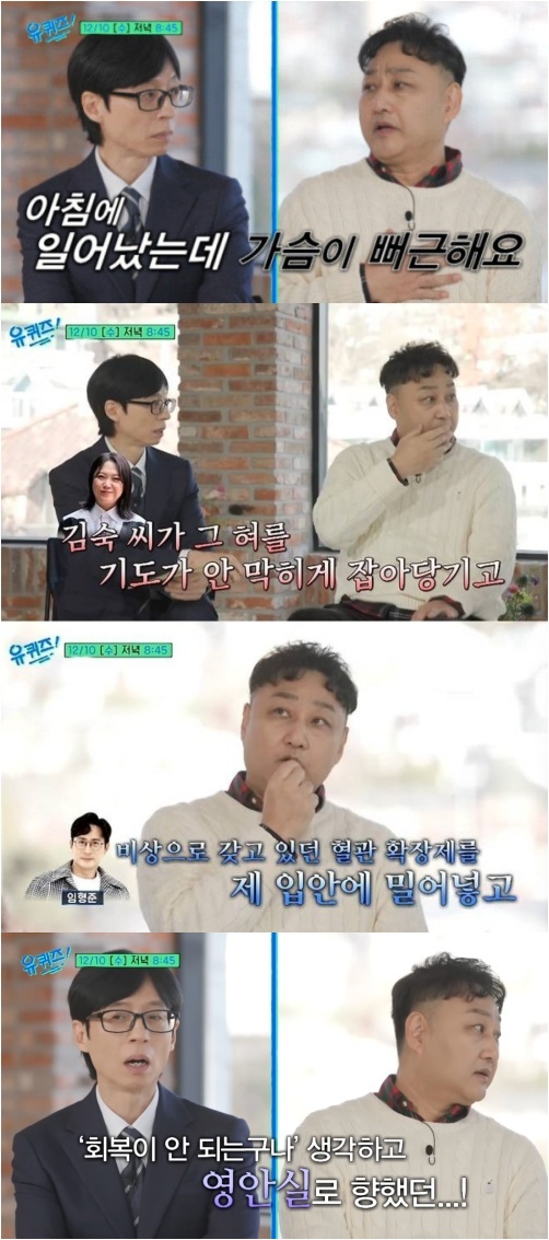 사진 = tvN ‘유 퀴즈 온 더 블럭’ 그는 “내 혀가 말렸다고 하더라. 김숙씨가 기도가 안 막히도록 혀를 잡아당겼다. 임형준씨는 비상으로 갖고 있던 응급혈관확장제를 내 입에 밀어 넣었다”며 “제세동기를 7번이나 해도 심장이 뛰지 않았다. 회복이 안 되는구나 생각해 영안실로 향했다”고 아찔한 상황을 전했다. MC 유재석은 “형이 회복하고 전화를 받더라. ‘(심폐소생술로) 갈비뼈에 금이 가서 더 아프다. 내가 나가면 임형준이랑 김숙 고소할 거다’라고 농담도 했다”며 웃었다. 이에 김수용은 임형준이 “형님. 상해죄로 고소한다는 얘기 들었습니다. 선처 부탁드립니다”라고 문자가 왔다며 “다시 태어났다는 생각으로 감사하면서 살겠다”고 전했다.