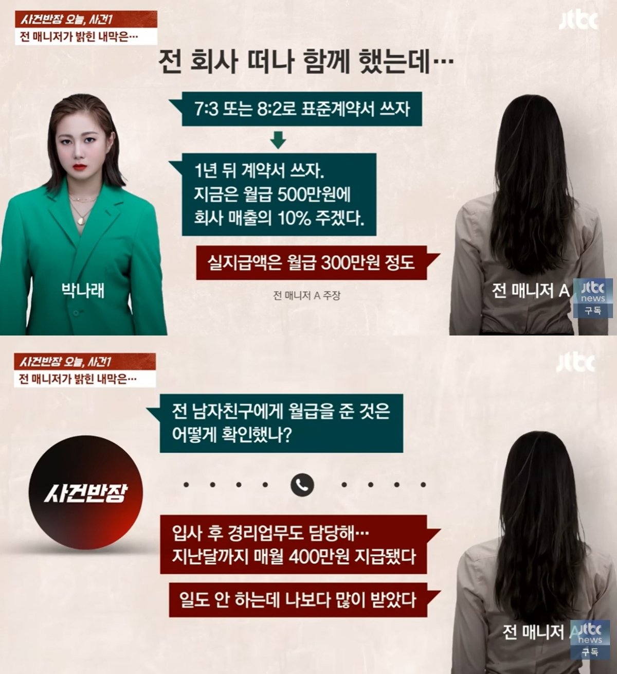 JTBC 사건반장 화면 캡처. 정산 약속 번복 등에 대해서도 폭로했다. A씨는 박나래가 소속사를 함께 옮기는 과정에서 매니저들에게 “7대3, 8대2 정산을 하자면서 계약서를 쓰자 했는데, 나중에 (새 회사에서) 일을 시작한 후에는 말을 바꿔서 계약서를 1년 뒤에 쓰자고 했다”고 밝혔다. 또 “(이후 박나래가) 월급 500만원에 매출 10%를 주겠다고 했지만 실제 지급액은 월 300만원 정도였다”고 덧붙였다.