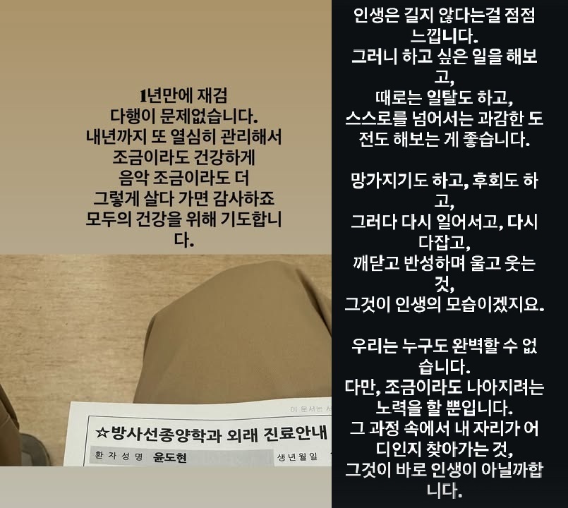 8일 윤도현은 자신의 SNS를 통해 방사선종양학과 외래 진료 안내문 사진을 게재했다. 그는 “1년 만에 재검, 다행히 문제없다”고 밝혔다. 이어 “내년까지 열심히 관리해서 조금이라도 건강하게 음악을 더 할 수 있게 그렇게 살다 가면 감사할 것 같다”며 팬들에게 자신의 심경을 전했다. 그러면서 그는 “모두의 건강을 위해 기도한다”고 덧붙였다.