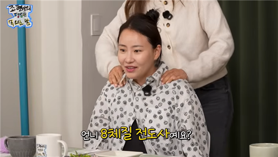 조현아의 어깨를 주물러주는 옥주현. 조현아의 평범한 목요일 밤 옥주현은 “내가 해봐도 되냐”며 조현아의 목을 주물렀다. 조현아는 “신경통이 심하게 왔었다. 오른쪽 마비가 왔었다”고 말했다. 옥주현은 조현아의 뒤로 가 “(권)순일이보다 나를 더 신봉하게 될 거다”라며 자신감있게 본격적인 안마를 시작했다. 조현아는 “언니가 아는 정보가 너무 많다고 한다. 저 진단해주세요”라며 옥주현에 신뢰를 보였다. 이어 “언니 8체질 전도사에요? 뭐예요?”라고 물었고 옥주현은 “나 목양이야. 태음인, 태양인 이런 거에서 더 갈래가 많은 것 중 하나다”고 세세한 의학 지식을 뽐냈다.