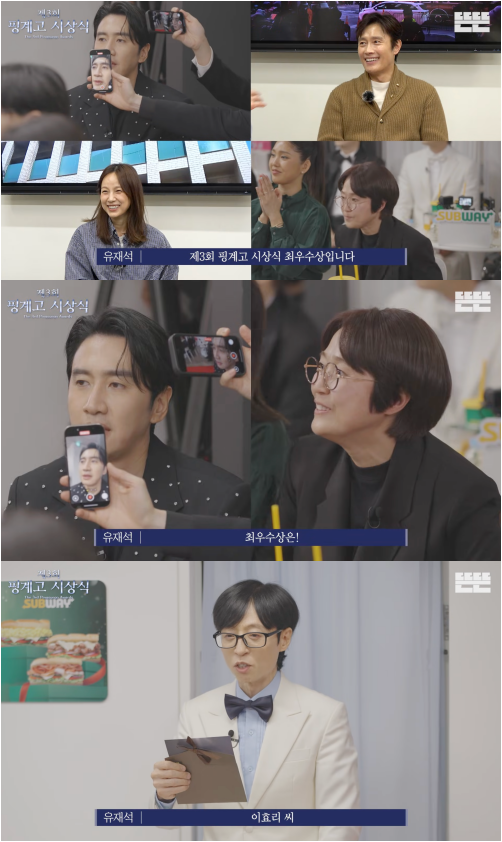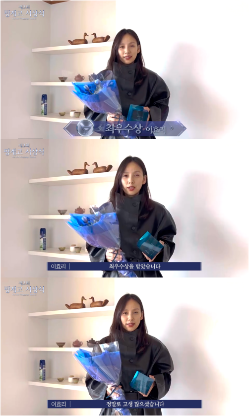 사진 = 유튜브 채널 ‘뜬뜬 DdeunDdeun’ 하지만 최우수상의 영예는 이효리에게 돌아갔다. 영상으로 등장한 이효리는 “최근에 상을 받은 게 없었는데 ‘핑계고’에서 상을 주셨다. 오랜만에 연말에 상 받는 기분을 느끼게 해주셔서 진심으로 감사드린다”고 소감을 전했다. 이어 이효리는 “재석이 오빠 만나서 이런저런 편안한 이야기 나누고, 현희랑 이쓴 부부와 즐거운 시간을 보냈다. 이렇게 상까지 주셔서 정말 감사하다”며 “우리 제작진 여러분 한 해 동안 또 많은 분들 모시고 속 깊은 이야기 들려주셔서 너무 감사드린다. 재석 오빠도 올 한 해 정말 고생 많으셨습니다”고 덧붙이며 내년에는 대상을 노리겠다는 포부를 밝혀 웃음을 더했다.