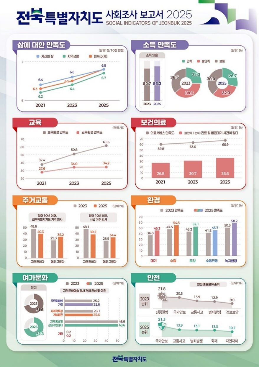 전북도 관계자는 “이번 사회조사 결과는 도민들이 체감하는 삶의 질이 실제로 향상되고 있음을 보여주는 것”이라며 “도민 의견을 정책에 적극 반영해 삶의 변화를 체감할 수 있는 행정을 펼칠 것”이라고 말했다.