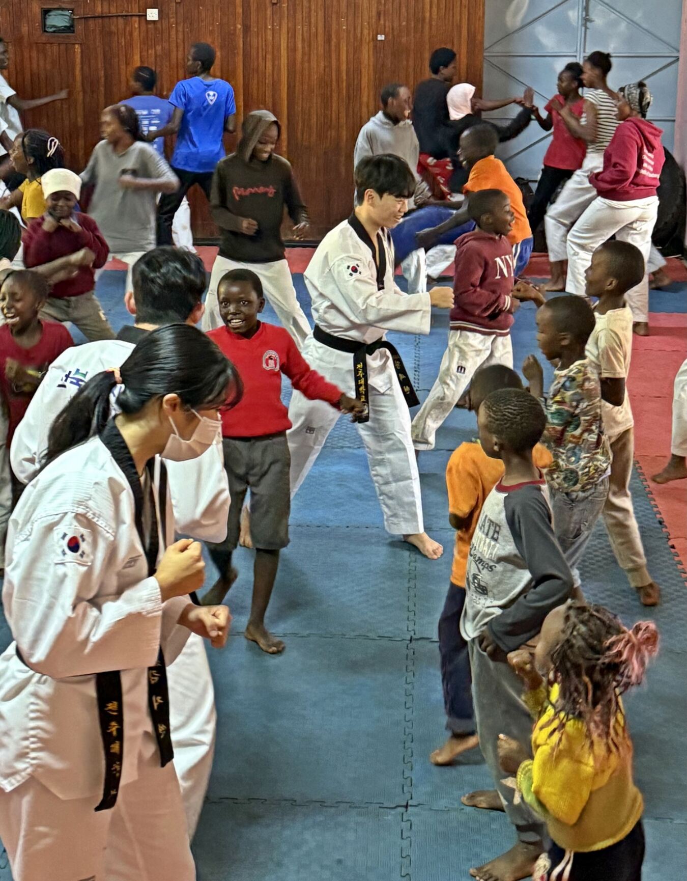 싸울아비 시범단이 케냐 수도 나이로비 빈민가의 한 태권도 클럽을 찾아 학생들을 지도하고 있다. 전주대 제공 공연은 케냐 태권도연맹의 공식 요청으로 성사됐으며, 대회 기간 주케냐 대한민국 대사관이 주관한 ‘한국문화주간’ 행사에서도 메인 무대를 맡아 전북이 세계 태권도의 중심지임을 알렸다. 싸울아비의 여정은 무대에만 머물지 않았다. 이들은 나이로비 빈민가에 있는 ‘와이타카 태권도 클럽’을 찾아 현지 초·중·고 학생 60명과 합동 훈련을 진행했다. 기본 기술 지도는 물론 예의와 인내, 상호 존중 등 태권도의 정신을 전하며 나눔을 실천했다.