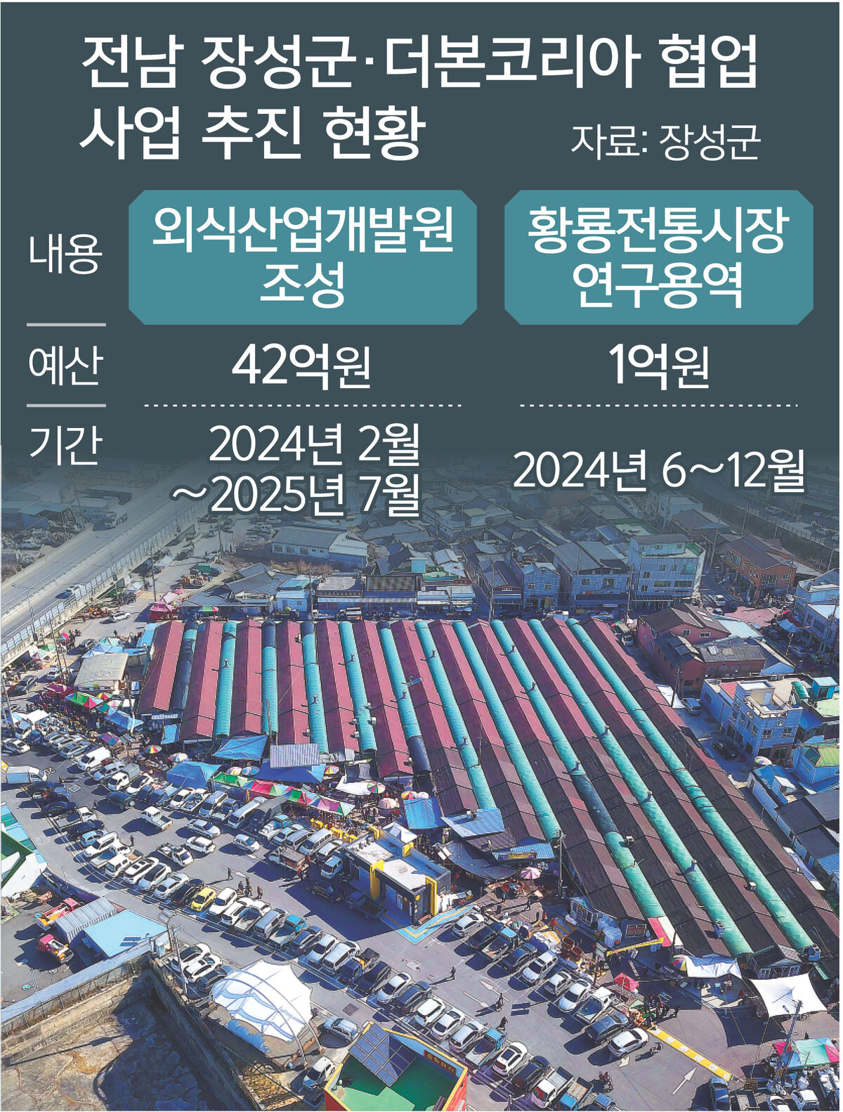 전남 장성군이 요리사업가 백종원씨가 대표로 있는 회사와 손잡고 추진한 황룡전통시장 활성화 연구용역과 더본외식산업개발원 구축 사업이 2년째 지지부진하고 있다. 민선 8기 장성군이 백 대표의 명성만 믿고 추진했던 전통시장 활성화 사업 관련 용역은 9월 현재까지 3차례 계약 기간 연장을 거듭하고 있다.