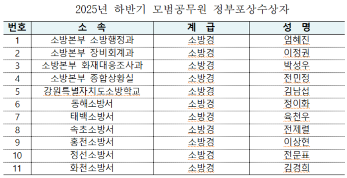 [스포츠서울ㅣ춘천=김기원기자]강원특별자치도 소방본부(본부장 오승훈)는 29일 도청 신관 2층 소회의실에서 ‘2025년 하반기 모범공무원 정부포상 수여식’을 개최했다고 밝혔다.