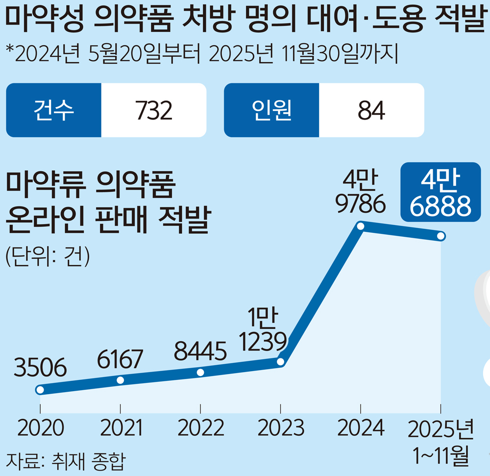 타인의 명의를 도용해 수백 차례에 걸친 불법 처방을 받은 사례도 있다. 지난 7월 서울동부지법 형사9단독 이중민 판사는 가족과 지인의 주민등록번호를 도용해 마약류 의약품을 처방받은 50대 여성 박모씨에 징역 8개월에 집행유예 2년을 선고했다. 박씨는 2021년 10월부터 올 3월까지 이 같은 수법으로 졸피뎀 등 향정신성의약품을 225회 처방받은 것으로 조사됐다. 개인 확인 절차가 생기면서 명의도용이 전보다 까다로워졌지만, 가족과 지인을 통한 대리 수령이나 온라인 등을 통한 사적 거래는 오히려 늘었다는 지적이 나온다. 식약처가 적발한 마약류 의약품 불법 판매·알선 게시물은 올해만 11월까지 4만6888건이었다. 2021년 6167건에서 660.8% 증가한 수치로, 2022년 8445건, 2023년 1만1239건, 지난해 4만9786건으로 꾸준히 늘고 있다.
