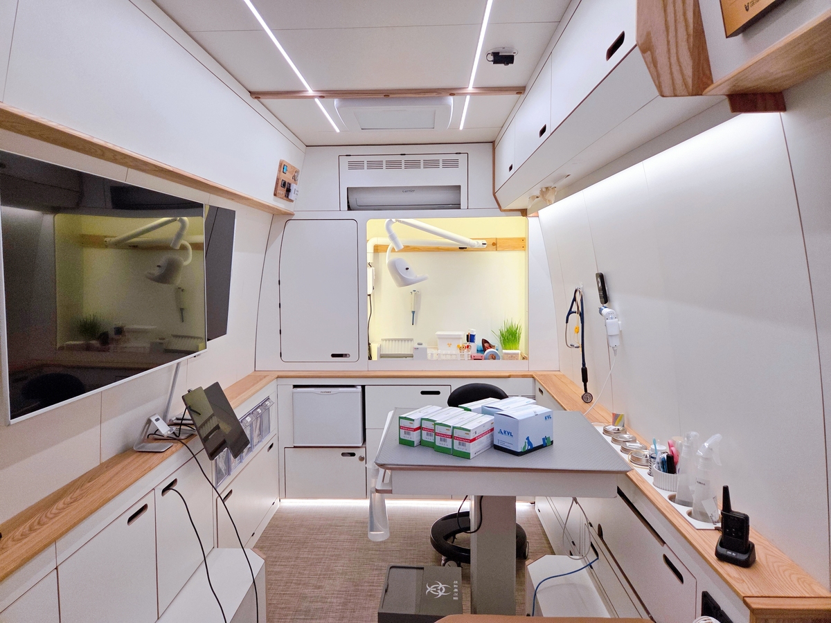 펫팅 검진 차량의 넓은 내부 공간에 각종 수의 의료기기와 보조 기구들이 마련돼 있다. 박재림 기자
