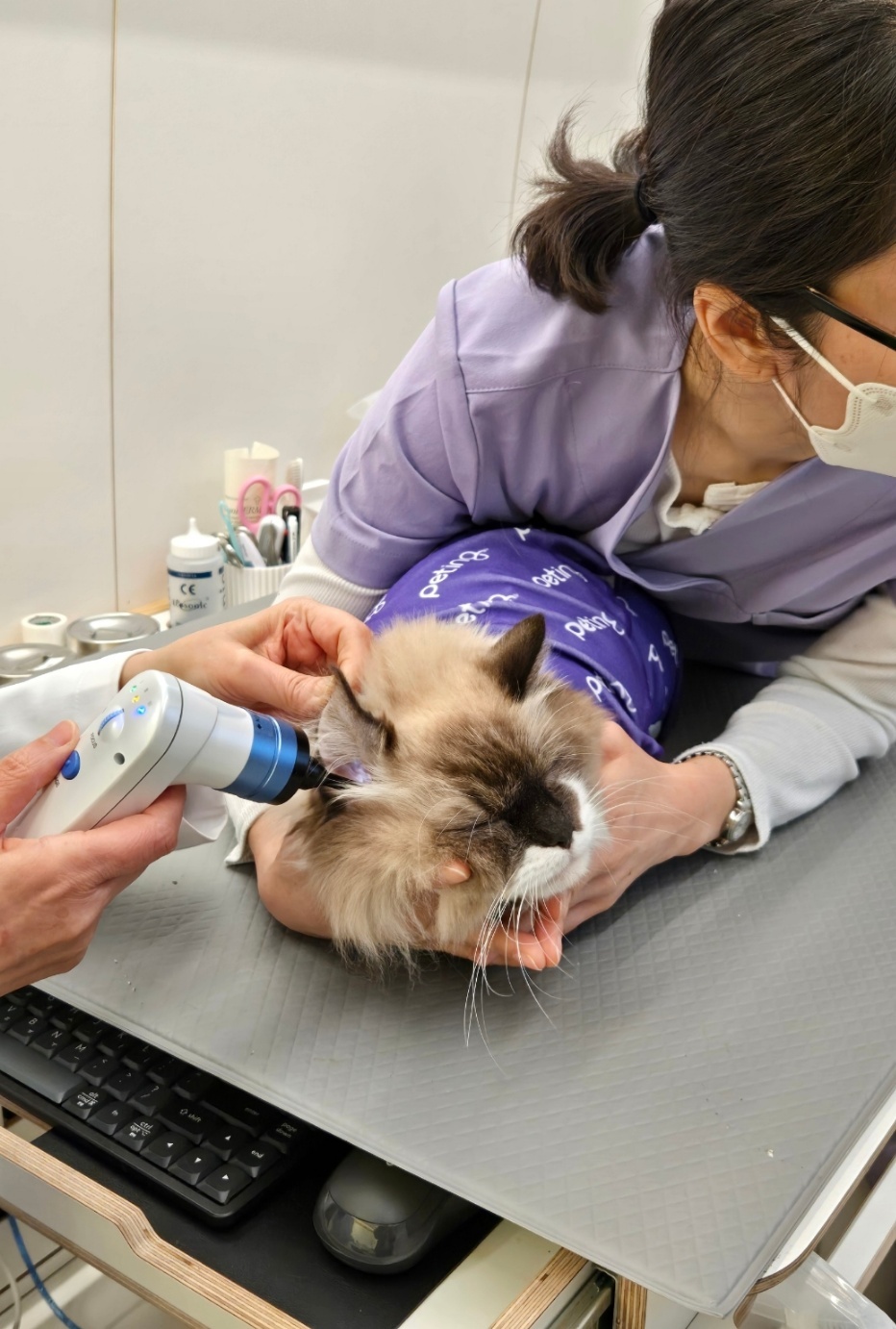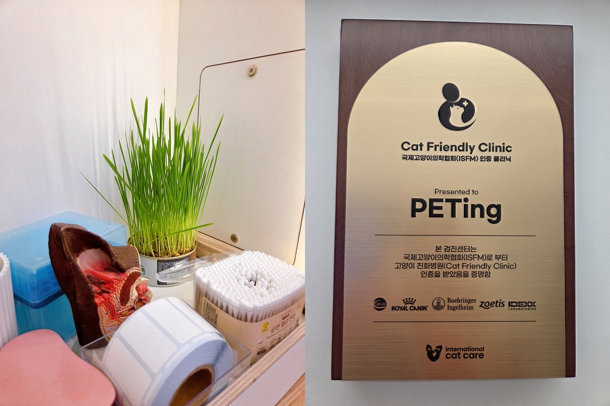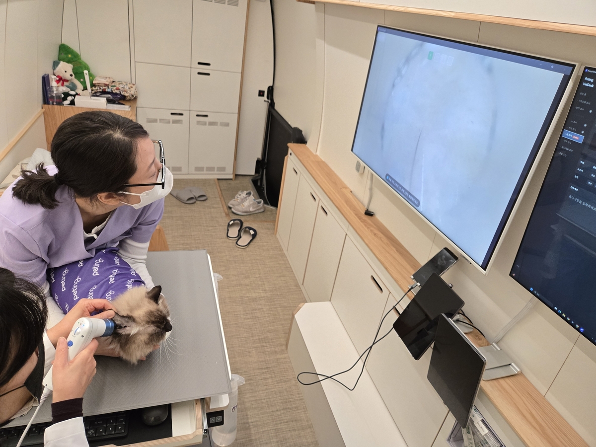 수의사와 수의 테크니션이 검진 차량 내부의 대형 모니터를 통해 반려묘의 귀 상태를 확인하고 있다. 펠즈 제공 반려동물과 수의사가 다치지 않고 안전하게 검사를 받을 수 있는 펫팅만의 접착식 담요, 고양이의 정신 안정을 위한 캣닙 화분, 빛에 민감한 반려동물을 위해 밝기를 조절할 수 있는 조명, 계절에 맞춰 사용할 수 있는 온열매트와 에어컨 등 세심한 보조 물품도 인상적이었다. 국제고양이의학협회의 고양이친화병원 인증패가 걸려 있을 만 했다.
