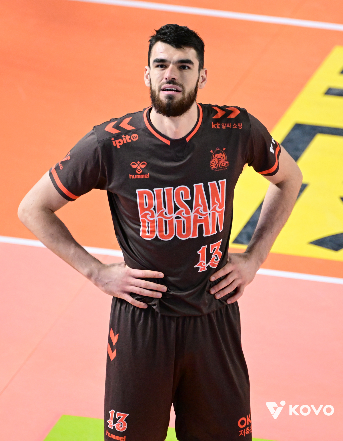 OK저축은행 디미트로프가 아쉬운 표정으로 코트 위를 바라보고 있다. 사진=KOVO 제공