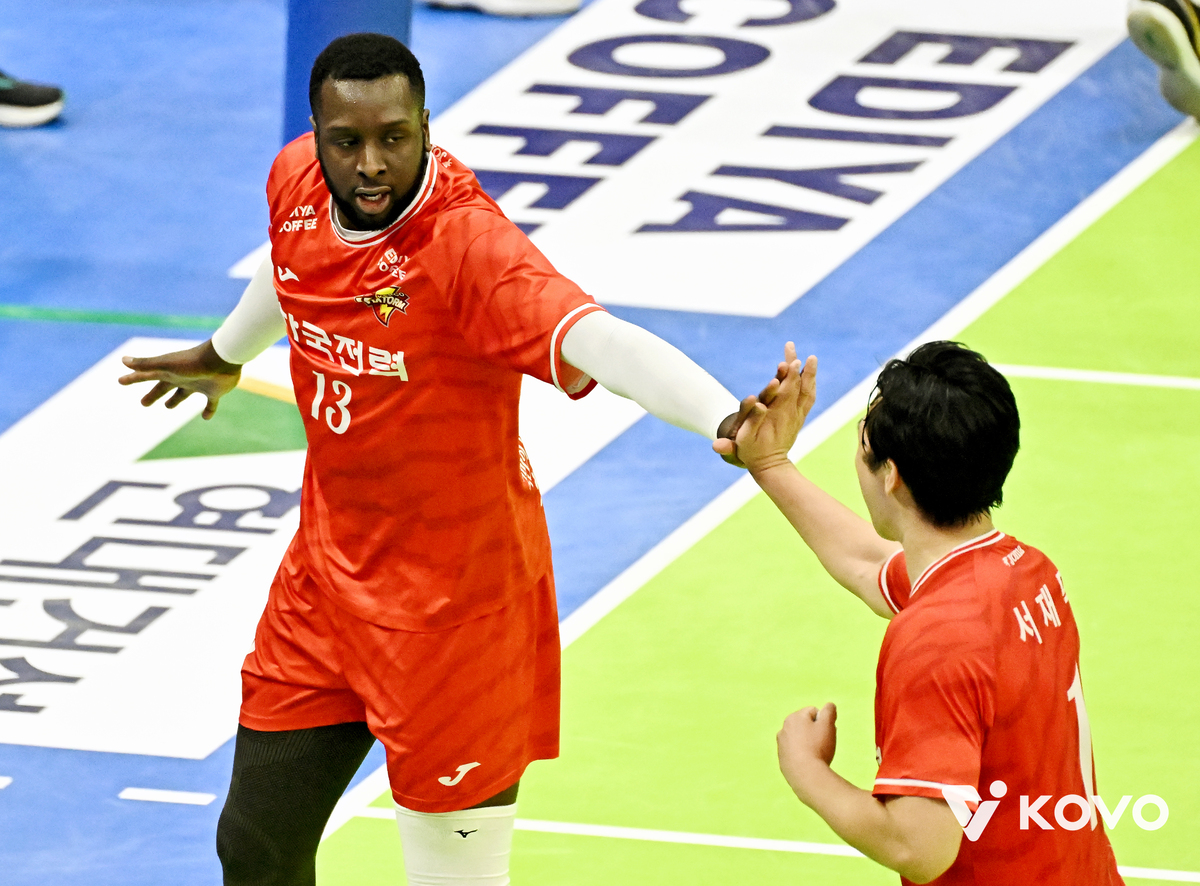 한국전력 베논(왼쪽)이 득점을 올리고 기뻐하고 있다. 사진=KOVO 제공 한국전력은 폭발하는 외인 에이스 베논으로 연승 유지에 나선다. 리그 득점 1위(411점)의 베논은 1라운드에 공격성공률 47.81%로 허덕였지만, 3라운드 들어 적응을 마치며 이 수치를 52.50%까지 올랐다. 팀에 에디·김정호 등 부상자가 속출하는 건 아쉽지만, 그 자리를 채우는 박승수·윤하준 등의 백업도 한국전력 상승세에 힘을 보태고 있다.