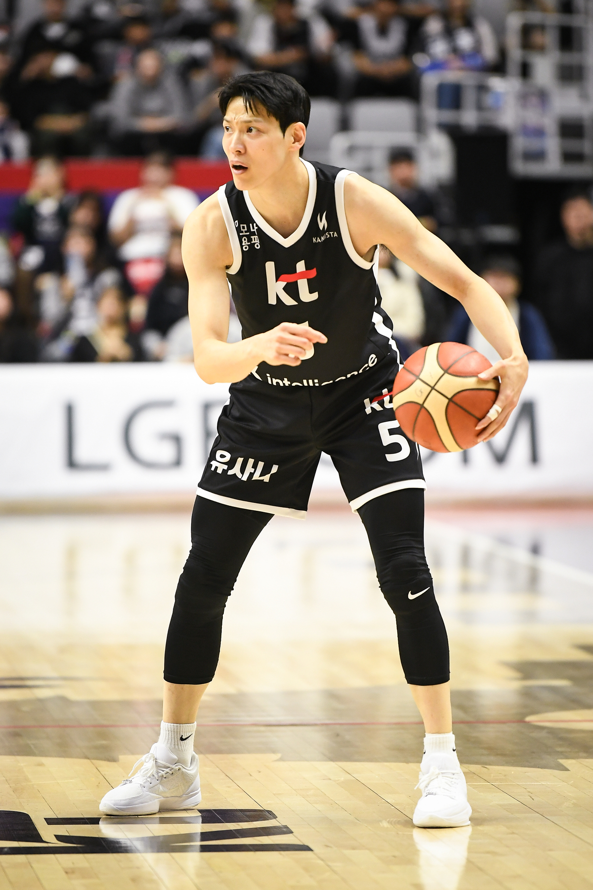 KT 베테랑 가드 김선형이 지난달 8일 수원에서 열린 KCC전 도중 공을 쥔 채 숨을 고르고 있다. 사진=KBL 제공