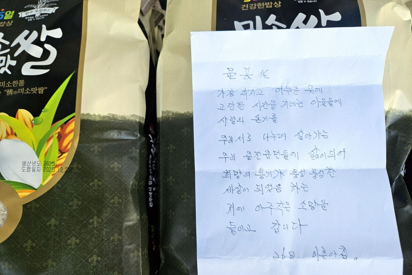 전북 완주군 용진읍 행정복지센터 입구에 10㎏들이 쌀 60포대화 함께 놓고 간 쌀 기부 천사의 편지. 완주군 제공 이날 봉동읍 고천리 명탄마을 이장 이선영(44)씨는 취약계층의 겨울나기를 돕기 위해 쌀 60포대를 봉동읍에 기탁했다. 그는 2015년부터 매년 직접 농사지은 쌀을 이웃과 나누고 있다. 기초생활거점 2차사업 주민위원회도 이날 나눔 활동으로 운주면에 쌀 30포대를 맡겼다. 용진읍 이장협의회와 새마을부녀회 역시 해마다 직접 재배한 쌀과 배추로 김장 김치를 담가 이웃들에게 전하고 있다. 설선호 용진읍장은 “18년 가까운 시간 동안 말없이 이어진 나눔이 용진읍을 더욱 따뜻한 공동체로 만들고 있다”며 “기탁자의 뜻을 소중히 담아 꼭 필요한 이웃들에게 정성껏 전달할 것”이라고 말했다.