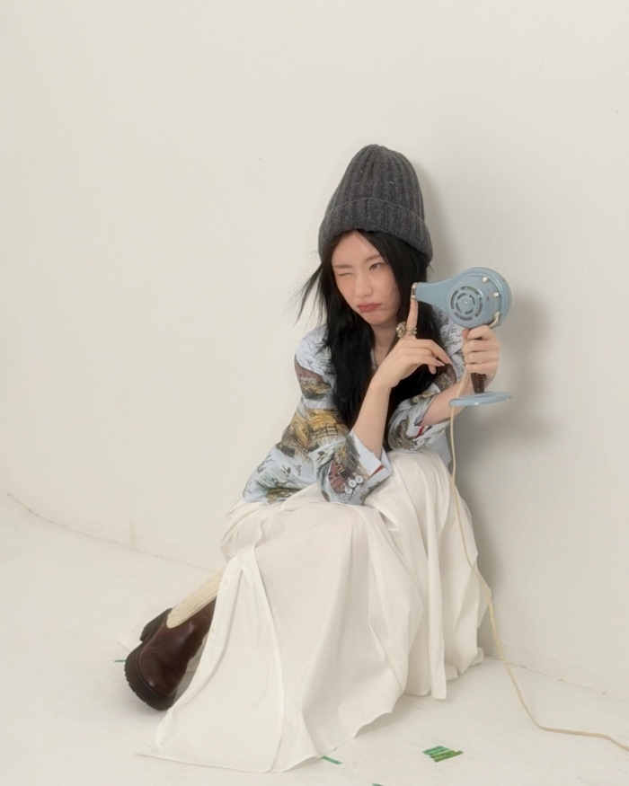 사진 = 채령 SNS 계정 또 다른 컷에서는 회색 비니와 화려한 패턴 셔츠, 롱스커트를 착용하고 힙한 분위기를 연출했다. 빈티지한 하늘색 헤어드라이어 소품을 들고 익살스럽게 윙크하는 모습에서는 채령 특유의 사랑스러움이 돋보였다.
