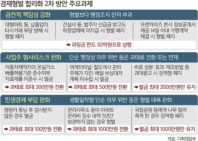 정부와 더불어민주당은 30일 당정협의회를 열고 이 같은 내용의 ‘2차 경제형벌 합리화 방안’을 발표했다. 과도한 형벌이 사업자의 경제활동을 위축시킬 수 있다는 경영계의 지적을 일부 수용하는 대신 금전적 책임을 강화해 제도의 실효성을 높이겠다는 취지가 담겼다.
