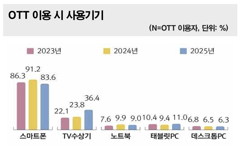 방송미디어통신위원회 제공 주목할 점은 OTT 시청 기기의 변화다. 스마트폰을 통한 OTT 이용률은 지난해 91.2%에서 7.6%p 감소해 83.6%를 기록했지만, TV로 OTT를 본다는 응답자 비율은 36.4%로 같은 기간 무려 12.6%p 폭등했다. 이는 시청자들이 이동 중에는 스마트폰을 쓰더라도 콘텐츠 감상은 거실의 대형 TV를 선택한다는 것을 의미한다.