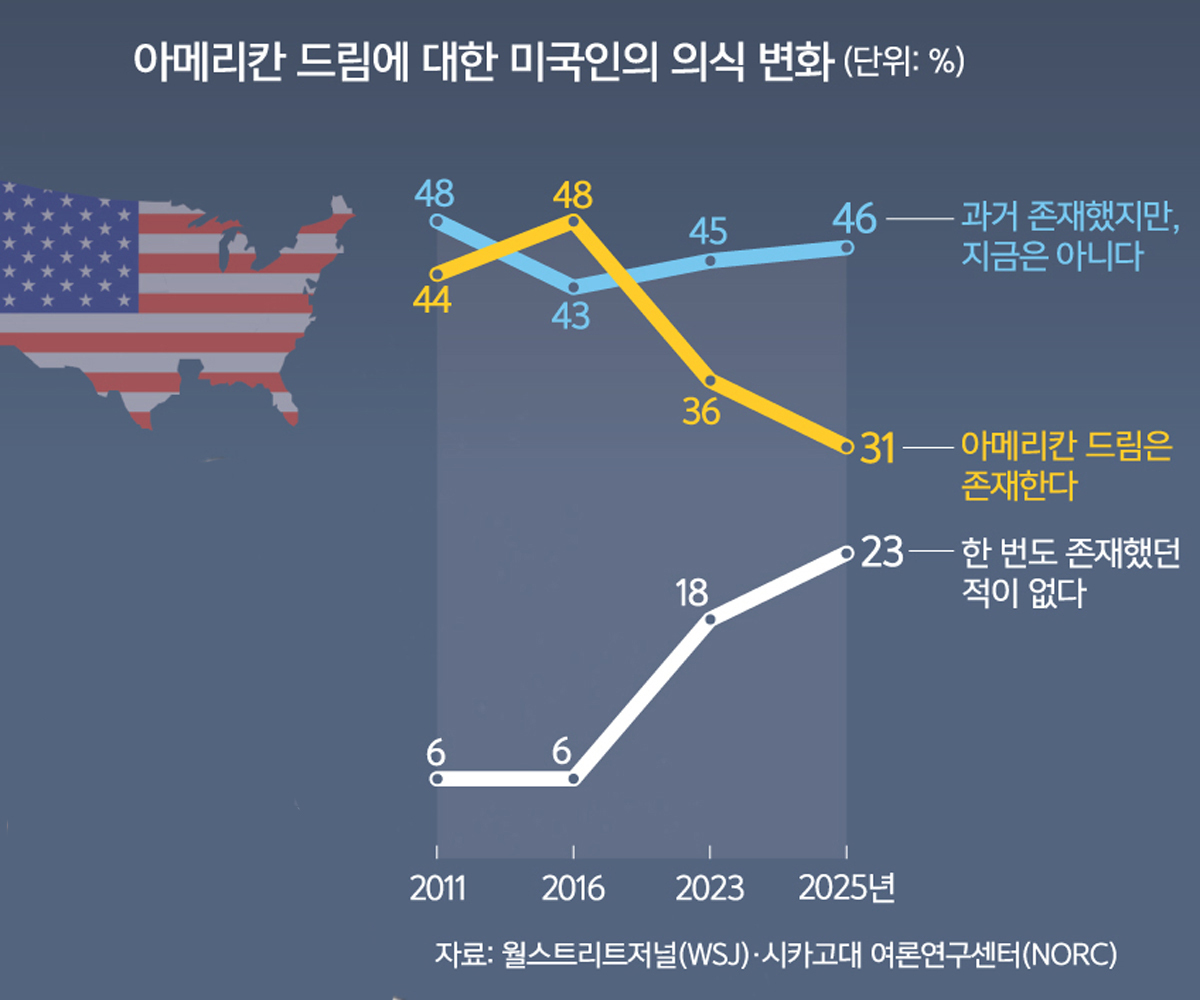 ◆“아메리칸 드림은 원래 없다” 10년 만에 4배 미국인들의 아메리칸 드림에 대한 부정은 21세기 들어 본격화하는 중이다. 지난 7월 발표된 월스트리트저널(WSJ)·시카고대 여론연구센터(NORC) 조사에서 ‘아메리칸 드림이 존재한다고 생각하느냐’는 질문에 “존재한다”고 대답한 응답은 31%에 불과했다. 2016년 48%에 비해 10년 만에 17%포인트나 감소했다. 현재 미국 사회에 아메리칸 드림이 존재하지 않는다고 대답한 응답은 70%에 육박했다.
