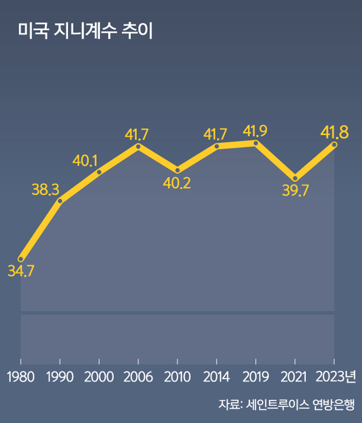 ◆양극화가 만든 좌절과 증오, 민주주의 파괴로 21세기 이후 부의 양극화가 극단적으로 진행된 영향이 좌절의 확산을 가속화했다. 1980년 34.7에 불과했던 미국 사회의 지니계수는 미 정부가 코로나19 팬데믹 지원금을 대폭 풀었던 2021년을 제외하면 2000년 이후 지속해서 40 이상을 유지 중이다. 지니계수란 소득 분배의 불평등 정도를 1에서 100 사이 수치로 나타내는 지표로, 40 이상은 ‘소득격차가 상당히 큰 국가’로 분류한다. 이미 미국은 20년 이상 불평등한 국가 위치에서 벗어나지 못하고 있던 것이다. 특히 2000년대 이후 인종 간, 성별 간 부의 불균형이 지속해서 확대되는 중이다.